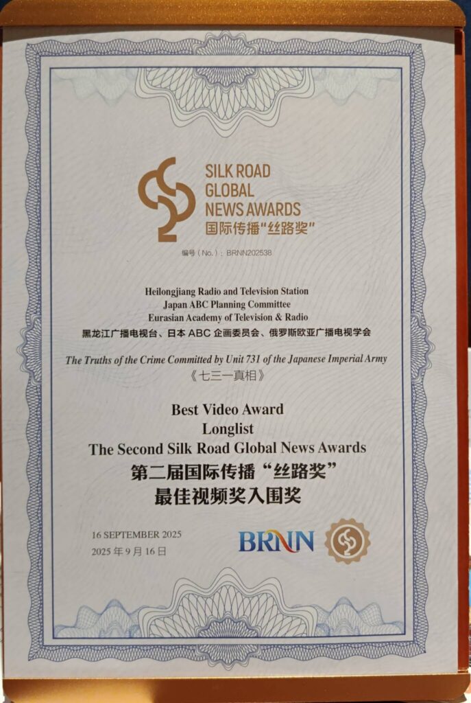Документальный сериал «Тайна об отряде 731» получил международную премию Silk Road Global News Awards в номинации «Лучшее видео» 16 сентября 2025 года. Награждение состоялось на форуме «Один пояс, один путь» в Куньмине (Китай) в присутствии 200 представителей 87 стран.