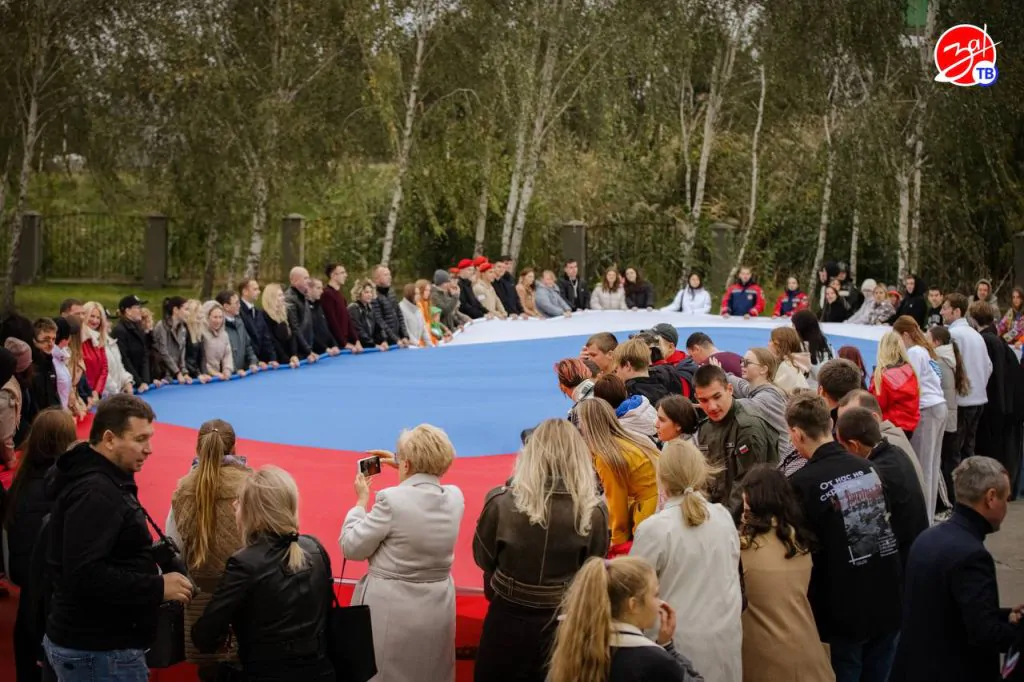Ко Дню воссоединения с Россией в Мелитополе прошла патриотическая акция. Ее участники развернули большой флаг России, состоящий из трёх цветов — белого, синего и красного.