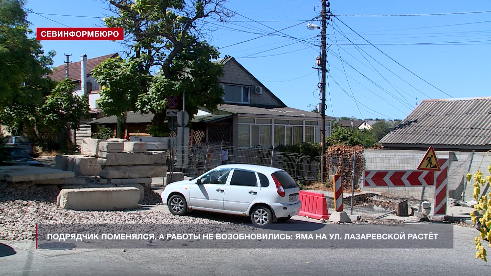 Тем временем, многолетняя яма на улице Лазаревской стала больше. Весной в эфире нашего телеканала мы рассказывали о затянувшемся ремонте водовода, из-за которого часть дороги остаётся разрытой на протяжении нескольких лет. В августе на объекте появился свежий информационный стенд – там указан новый подрядчик и срок завершения работ. Однако местные жители говорят, что к ремонту труб так и не приступали, а сама яма тем временем растёт.