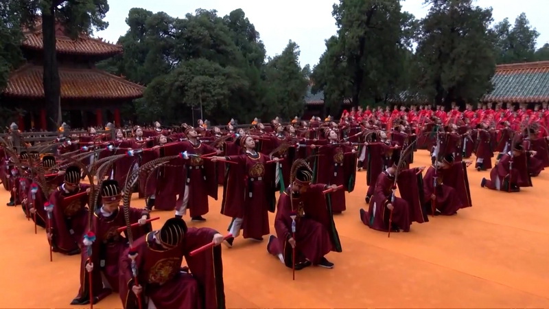 В храме Конфуция в городе Цюйфу прошла церемония почитания великого древнекитайского мыслителя. По всему комплексу раздался удар девяти колоколов. Затем по Священному пути процессия направилась к храмовому залу Дачэн, где находится главный алтарь в честь Конфуция и статуи его учеников.