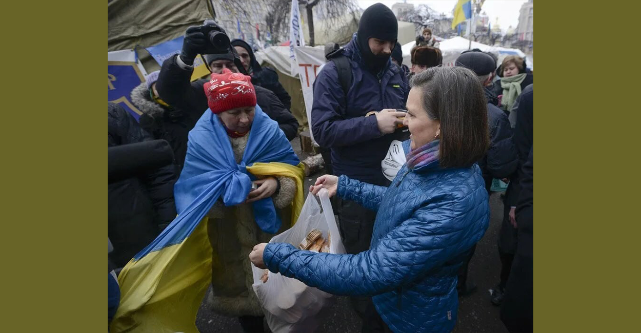 И тут же американские спецслужбы активируют подготовленную толпу. Сотрудник Госдепа США Виктория Нуланд раздаёт на Майдане те самые «печеньки», даже не скрывая своего участия.