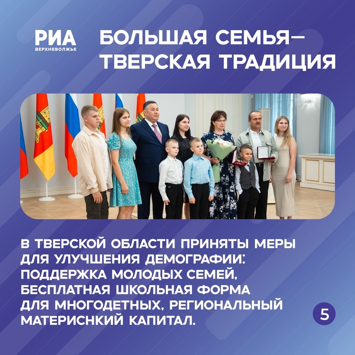 С губернаторства Игоря Рудени начался принципиально иной подход к семейной политике в нашем регионе. Будучи многодетным отцом, он действительно постарался возродить престиж института брака и семьи. Главе региона принадлежит ряд ключевых инициатив, например открыть в центре Твери Дворец бракосочетания (вместо старого ЗАГСа у автовокзала), а также вручать свежеиспеченным родителям подарочный набор с предметами первой необходимости для малышей. Больше всего преференций полагается, конечно, многодетным, что весьма логично, ведь, если в семье двое детей, это просто продолжение своей линии, а если трое и больше, это уже демографический рост. Теперь многодетных в нашем регионе обеспечивают бесплатной школьной формой, есть ряд прямых выплат и субсидий, есть конкурсы с хорошими призами: за «Лучшее семейное подворье», например, дают автомобиль. Также несколько лет назад был учрежден почетный знак «Слава Отца». Именно так - с заглавной буквой, чтобы более ярко обозначить мужскую роль в деле воспитания детей. В качестве бонуса к награде полагается денежная выплата в 100 тысяч рублей.