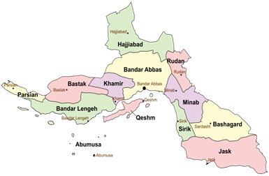 Провинция (остан) Хормозган, включающая 12 областей (шахрестанов). Область Сирик с одноименным главным городом в правой части карты, закрашена зелёным цветом.