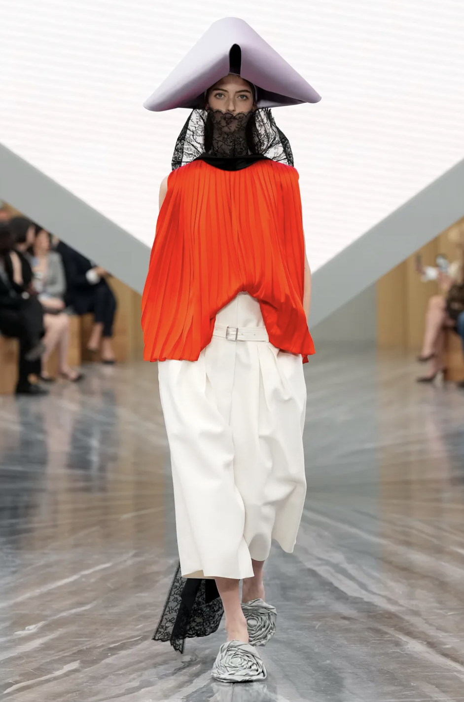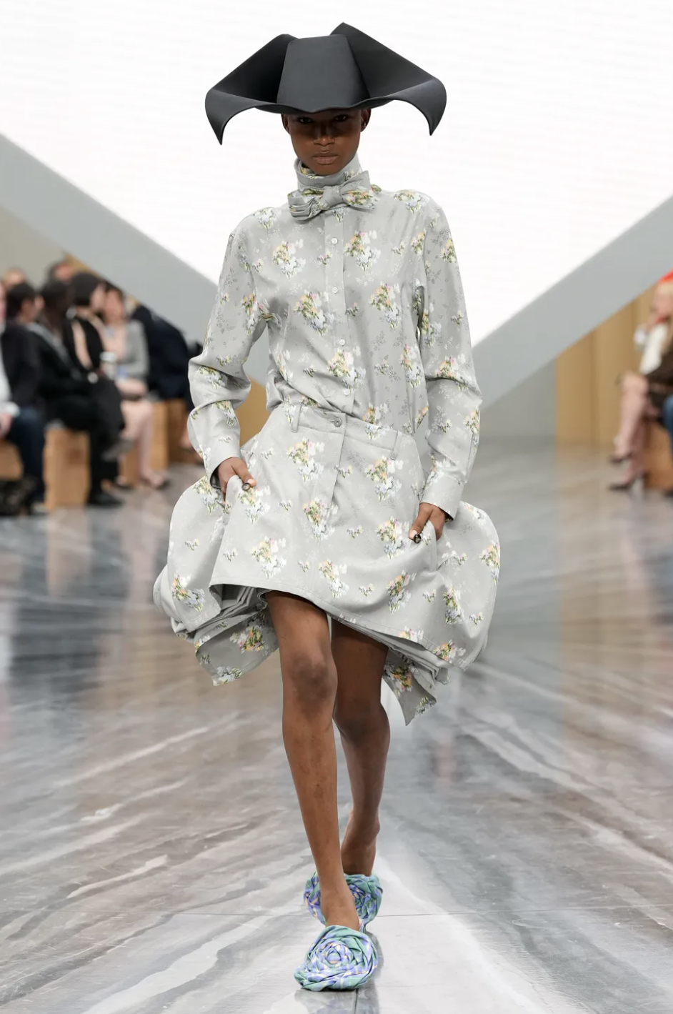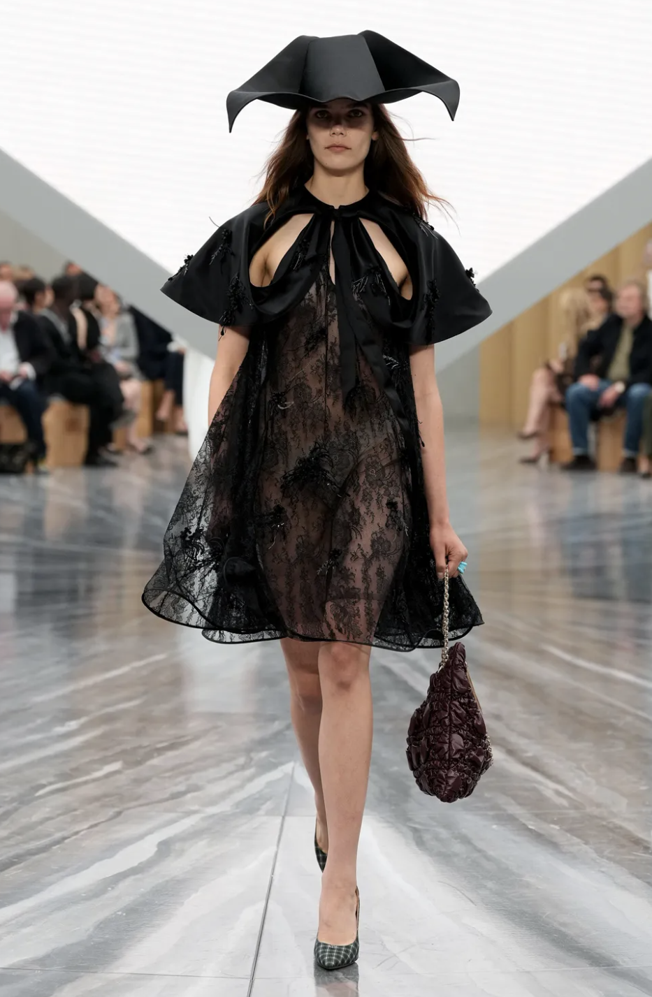 Однако в недавнем интервью i-D Андерсон намекнул — ему интересно развить идею конфликта жесткости и мягкости и посмотреть, как могут уживаться друг с другом свободная форма и строгая конструкция. Отсюда — необычные головные уборы, напоминающие одновременно пиратские шляпы и оригами, кожаные мини-юбки, более смелые вариации культового платья «Юнона» и новый взгляд на диоровский New Look: все та же плиссированная юбка с пиджаком, но никакой подчеркнутой талии.