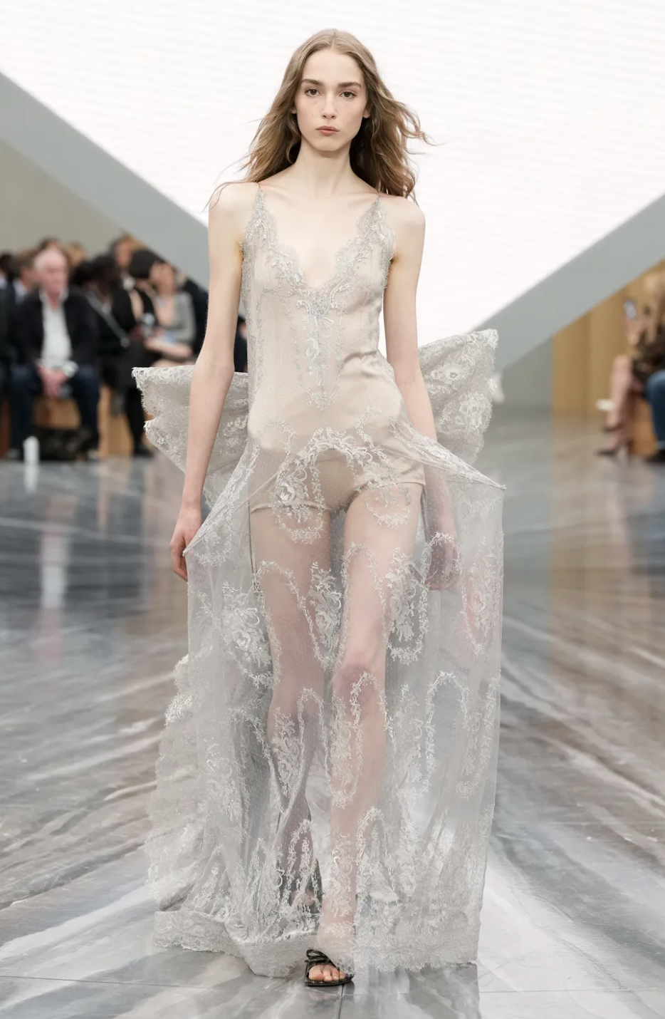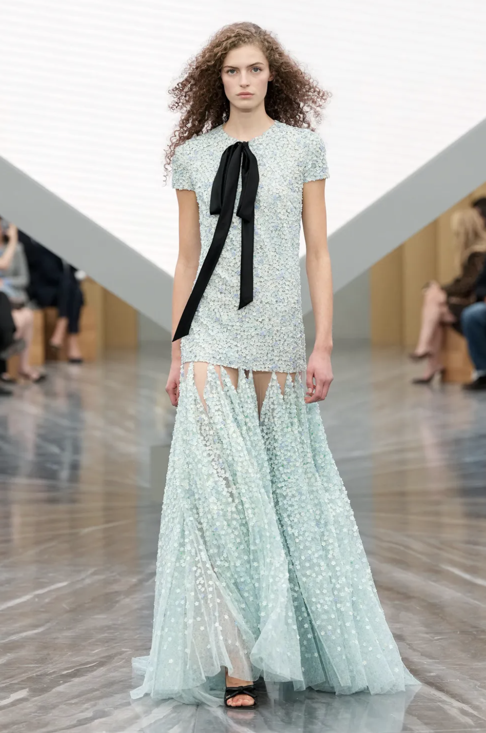 Одним из ключевых саундтреков показа стало стихотворение Джорджа Байрона She walks in beauty, like the night. Речь в нем идет о нежной и романтичной героине, которую модельер решил «вывести» на подиум и одеть в платья с рюшами, длинные юбки-баллоны и полупрозрачные платья с бантами (бантов было много. очень).