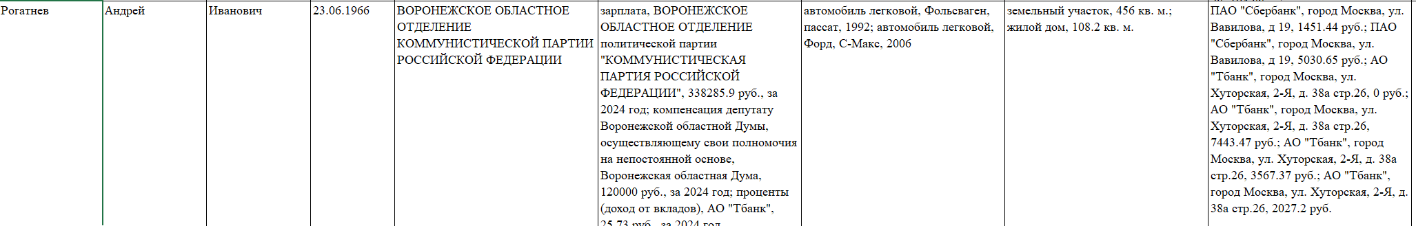 Товарищи из КПРФ стараются соответствовать своему статусу и демонстрируют достаточно скромные доходы. Во всяком случае, если речь идет о воронежских коммунистах. Так, зарплата главного представителя КПРФ в облдуме и в регионе в целом – Андрея Рогатнева – составил чуть меньше 460 тыс. рублей. 338, 2 тыс. из них заплатила партия, всего 120 тыс. – облдума. Не забыл депутат указать и сведения о доходе со вклада – 25 рублей.