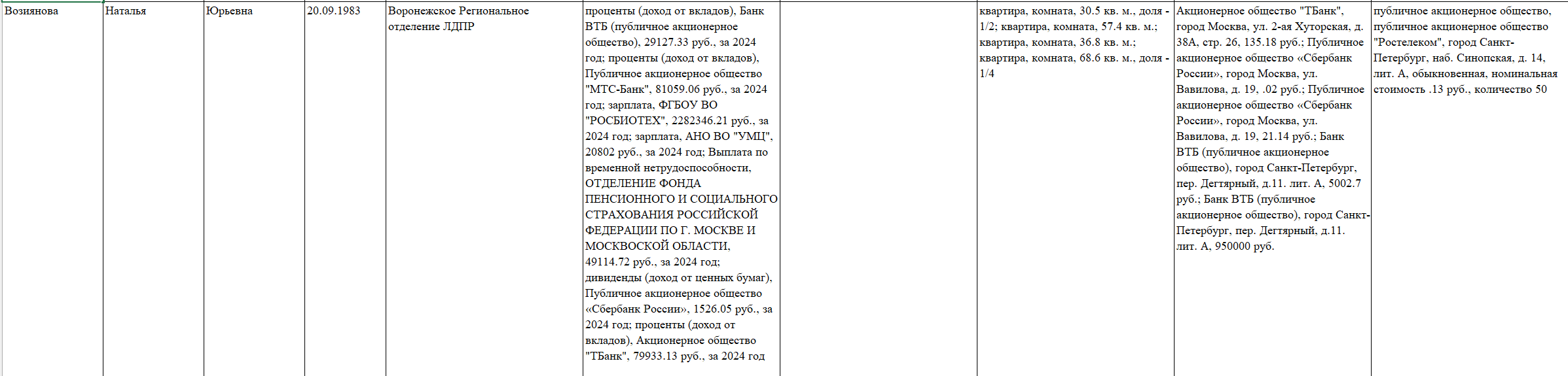 Оставшиеся 20,8 тыс. пришли на зарплатную карту депутата облдумы из «Университета мировых цивилизаций» имени Владимира Жириновского. Работа в двух университетах обеспечивала Наталье Возияновой средний ежемесячный доход в размере 191,9 тыс. рублей. Сумма доходов с банковских вкладов Возияновой – 190,9 тыс. рублей.