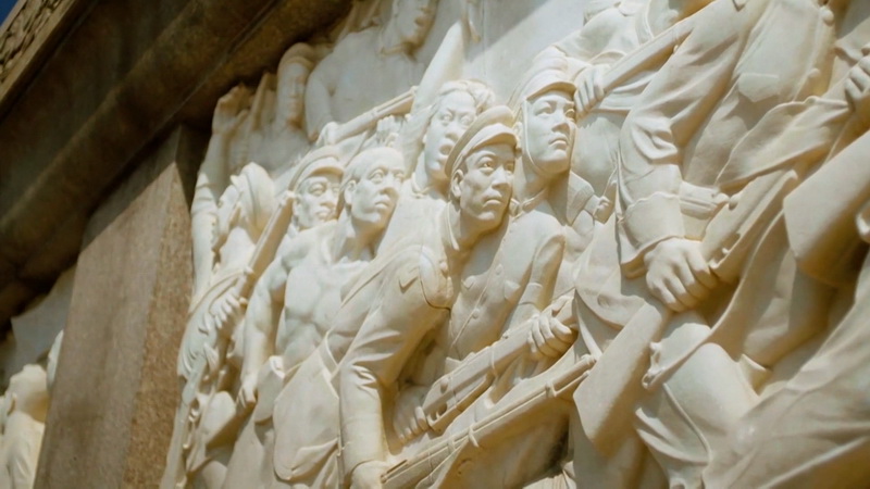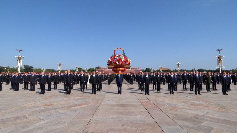 Участники церемонии возложили цветы к Памятнику народным героям. Этот мемориал высотой почти 38 метров построили в 1958 году, но его фундамент заложили 30 сентября 1949 – накануне Дня образования КНР. Он посвящён тем, кто отдал жизни в борьбе за национальную независимость, свободу и благополучие народа. В основании памятника – восемь барельефов, которые изображают сцены от Первой опиумной войны до основания КНР. На передней стороне монумента высечена рукописная цитата Мао Цзэдуна: «Вечная слава народным героям!». Также на одной из граней памятника размещено послание первого председателя КНР, в котором отдаётся дань уважения героям, павшим в Народно-освободительной войне, новой демократической революции и в тяжёлые времена после Первой опиумной войны.