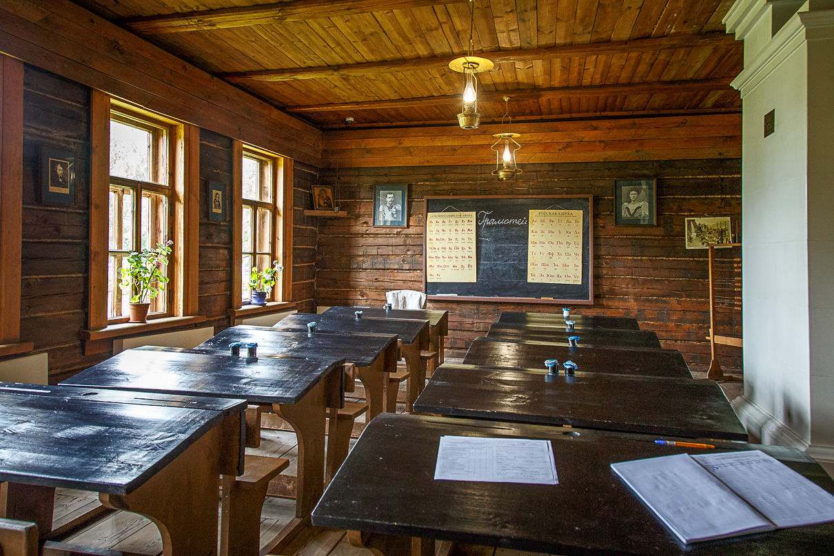 "В первый класс приходило более 45 человек, а вот оканчивали четыре класса не более 10. Девочки уходили, потому что надо было сидеть с младшими братьями и сестрами и помогать по хозяйству, мальчиков нередко направляли подмастерьями в лавки, кто-то просто не справлялся с учебой". — Ирина Агапова показывает документы в витрине земской школы. Подтверждение ее словам — экзаменационный листок тех, кто оканчивал четвертый класс, в нем всего 11 фамилий. Среди выдержавших экзамены можно увидеть фамилию Есенин, в его графе — одни пятерки. "Учился Сергей Есенин хорошо, перечитал все книги школьной библиотеки. Он считался одним из лучших учеников, его даже просили заниматься с отстающими. Однако проучился Сергей в школе не четыре года, а пять лет, — продолжает рассказ Ирина Агапова. — Дело в том, что в третьем классе его оставили на второй год — за хулиганство и озорство". Чтобы школьники, приезжающие в музей сегодня, могли почувствовать себя сверстниками Есенина, здесь есть специальные программы: дети оказываются на уроках, пробуют писать перьевыми ручками, используя алфавит, который существовал в начале ХХ века.