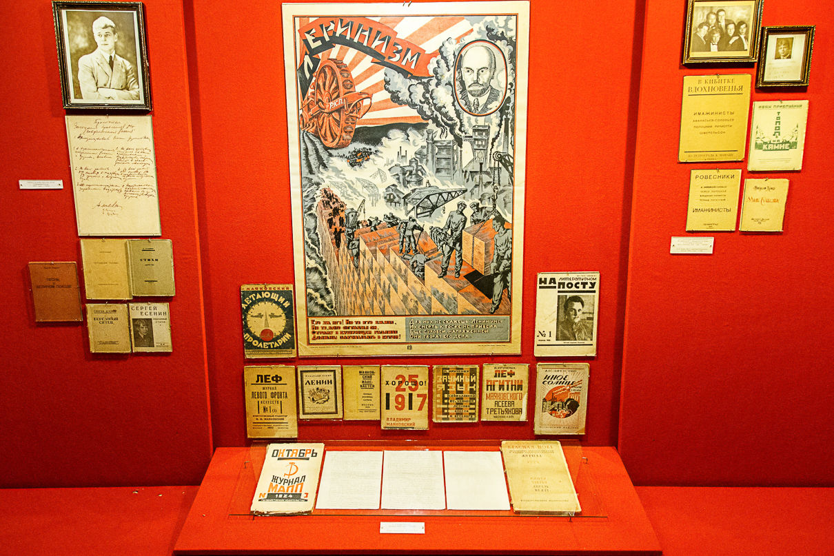 Переходя от витрины к витрине литературного музея, можно проследить все периоды жизни поэта — и творческой, и личной. Прямо напротив стендов с афишами имажинистов можно увидеть роскошный диван, красивые интерьерные мелочи, кокетливые наряды... Открывается новая страница биографии поэта — время знакомства с Айседорой Дункан. Знаменитая на весь мир "босоножка" приехала в Россию в 1921-м, в Стране Советов она собиралась создавать школу танца для девочек. Как говорили современники, влюбленность между молодым поэтом и известной танцовщицей вспыхнула сразу — несмотря на семнадцатилетнюю разницу в возрасте, несмотря на языковой барьер. Они поженились в 1922-м, и в тот же год Есенин отправился сопровождать супругу в зарубежных гастролях. Как говорил Есенин, "еду показать Западу, что такое есть русский поэт". Полтора года он пробыл за границей, объездил Европу, побывал в Америке, а успокоения, похоже, так и не нашел. С Айседорой они расстались...