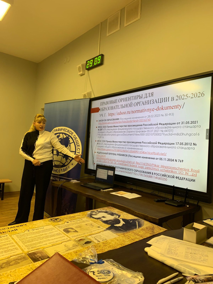 Председатель Ассоциации учителей географии Брянской области, учитель географии «Брянский городской лицей №1 имени А. С. Пушкина», член РГО – Наталья Жильцова выступила с сообщением «Психолого-педагогические аспекты формирования учебной мотивации на уроках географии» и разработанной программой «Место Географии Брянской области в ФООП на 2025-2026 учебный год»