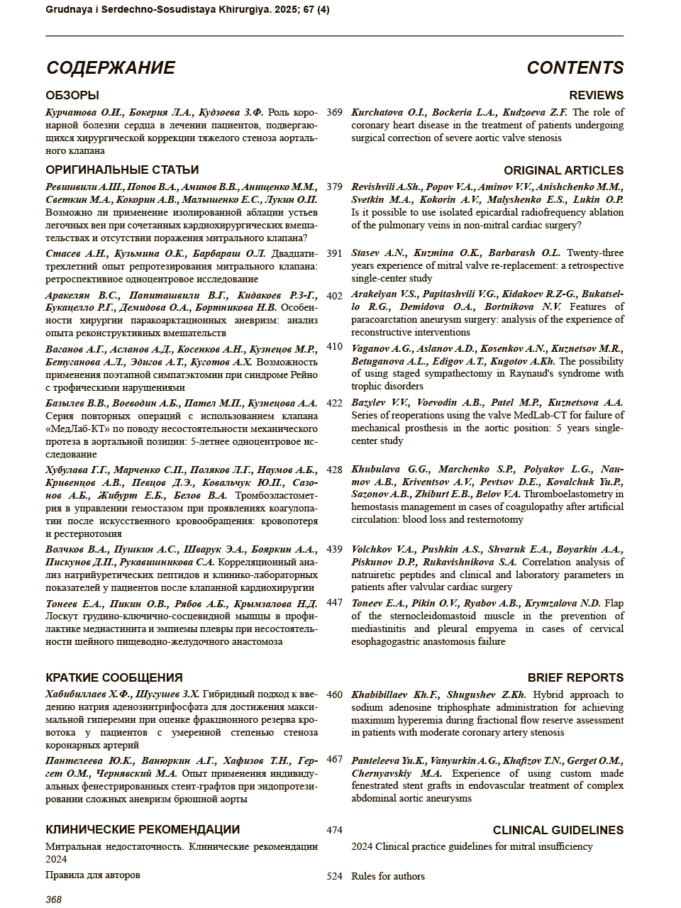 В этом номере (том 67, №4, 2025) представлены интересные материалы, освещающие вопросы современных подходов к оперативному и интервенционному лечению болезней сердца и аорты, а также обновленные клинические рекомендации по ведению пациентов с митральной недостаточностью.