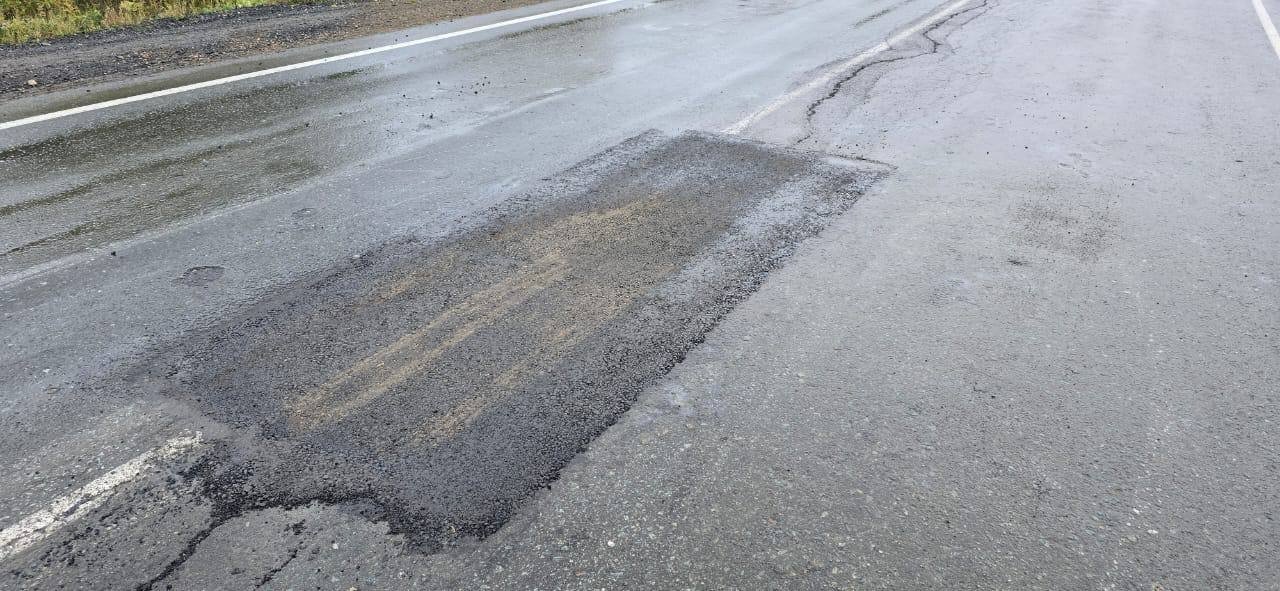 В Макаровском районе заделали глубокую яму на участке федеральной трассы