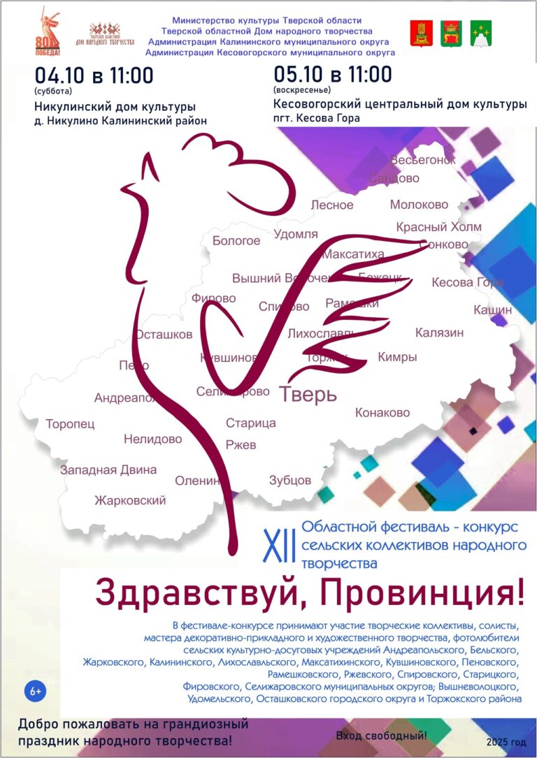Организатор фестиваля-конкурса «Здравствуй, Провинция!» - Тверской областной Дом народного творчества. А развернется это веселое, яркое действо 4 октября на площадке Никулинского дома культуры (Калининский муниципальный округ, дер. Никулино, ул. Школьная, д. 3); а 5 октября - в Кесовогорском центральном доме культуры (Кесовогорский муниципальный округ, пос. Кесова Гора, ул. Кооперативная, д. 14).
