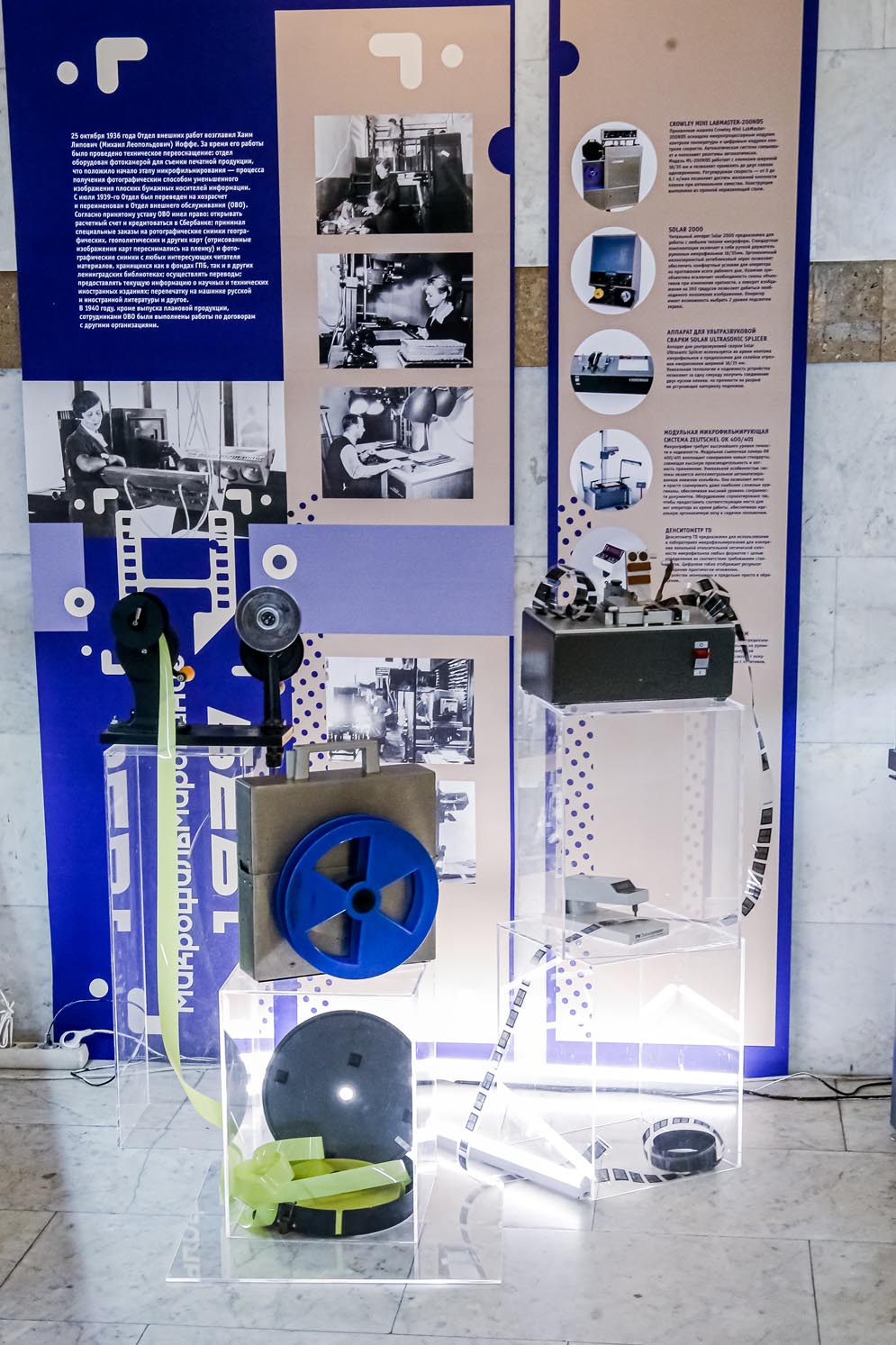Самые «яркие экспонаты» выставки - образцы технического оборудования, использовавшегося в работе Отдела внешнего обслуживания в разные годы. Это проектор для чтения микрофильмов, изготовленный в 1970-х годах, широко применяемый в библиотеках. Устройство позволяет проектировать изображение с микрофиш. При помощи объектива с высоким разрешением, с микрофиши, разновидности микрофильма, проецируется изображение. Сканер, используемый для оцифровки рулонных микрофильмов, выпущенный в 2008 году, делает доступными для читателей материалы фонда микроформ и отдела газет. Подобная техника очень востребована, поскольку, например, часть периодических изданий выдается только в формате микрофильмов ввиду их ветхости.