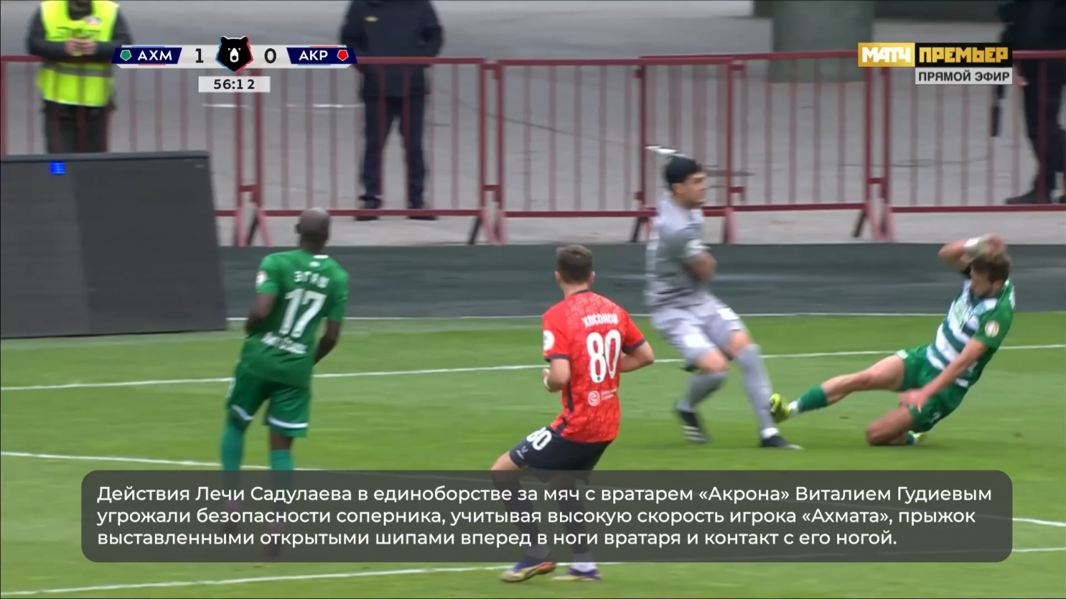 "Суть обращения: проверка решения судьи не удалять с поля игрока команды "Ахмат" Лечи Садулаева. Единогласное решение комиссии: судья ошибочно не удалил с поля игрока команды "Ахмат" Лечи Садулаева. Мотивировка: действия Лечи Садулаева в единоборстве за мяч с вратарем "Акрона" Виталием Гудиевым угрожали безопасности соперника, учитывая высокую скорость игрока "Ахмата", - сообщается на сайте РФС.