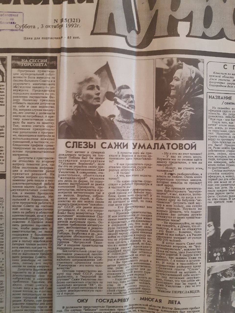 Например, 3 октября 1992 года на первой полосе «Воронежского курьера» выходил материал о митинге, который устраивали левые силы в столице Черноземья. Проходила акция протеста на площади Победы. Несогласные с политикой первого президента России Бориса Ельцина местные жители объединились под знамена «Трудового Воронежа». В качестве приглашенной гостьи на митинге присутствовала бывший депутат Верховного Совета СССР Сажи Зайндиновна Умалатова. К тому времени женщина-политик успела побыть активным участником I Съезда народных депутатов Советского Союза, поработать в Комитете управления и самоуправления страны, а также подписать обращение к президенту о необходимости созыва чрезвычайного Съезда народных депутатов (в 1991 году она уже понимала процессы распада «Красной державы»). Все называли Сажи Умалатову «женщиной-героем». Местная пресса, тем не менее, относилась скептически к личности этого борца.