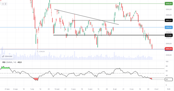 Индекс пробил все уровни поддержки и теперь подошел к главному уровню сопротивления 2600 пунктов. Учитывая перепроданность — вероятен отскок котировок.