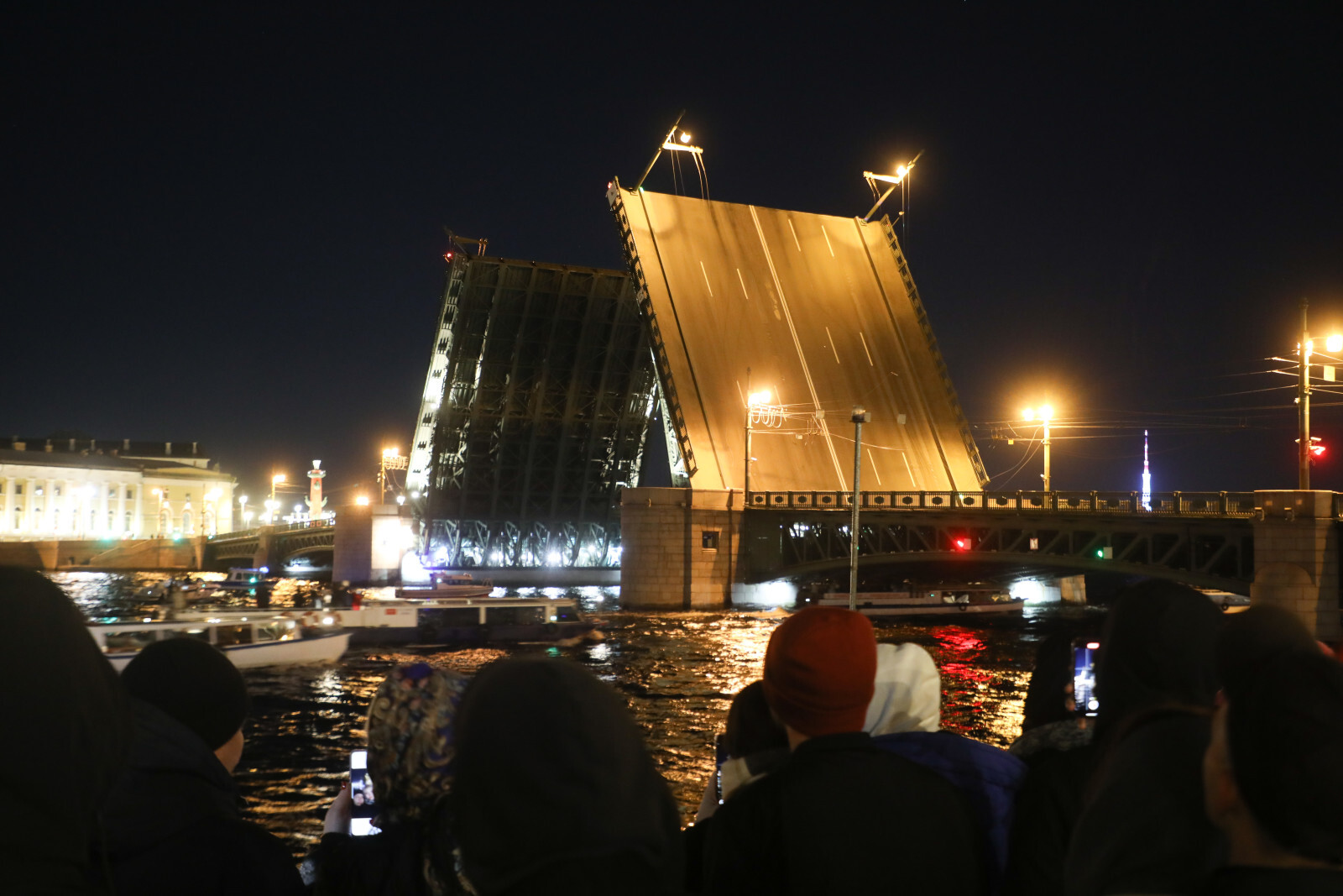 Дворцовый мост поднял свои пролёты под классическую музыку. Над Невой прозвучали «Гимн Великому городу» из балета Рейнгольда Глиэра «Медный всадник», строки Есенина и композиции Георгия Свиридова, голос Дмитрия Хворостовского и «Вальс» из «Метели» в исполнении Большого симфонического оркестра под управлением Владимира Федосеева.