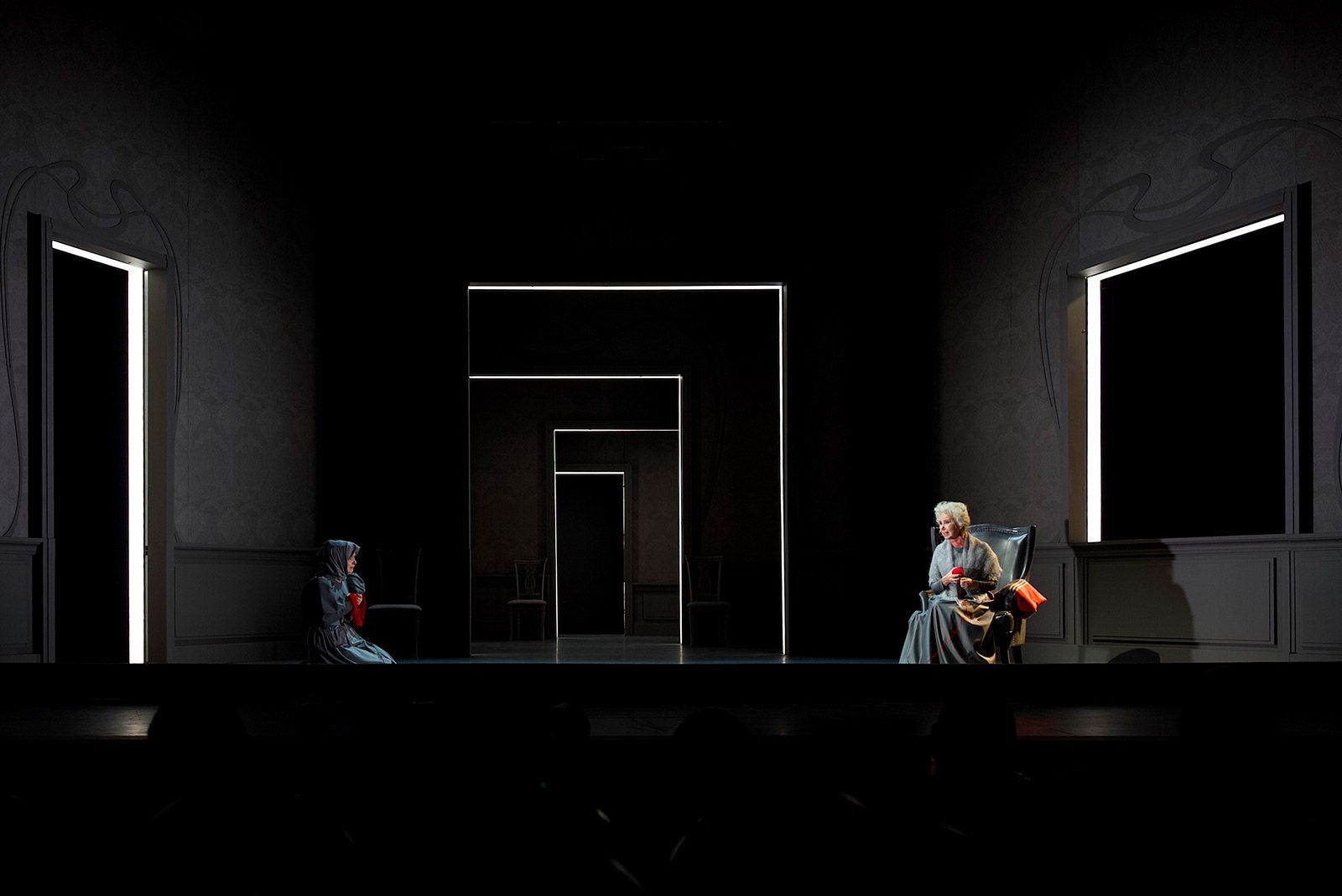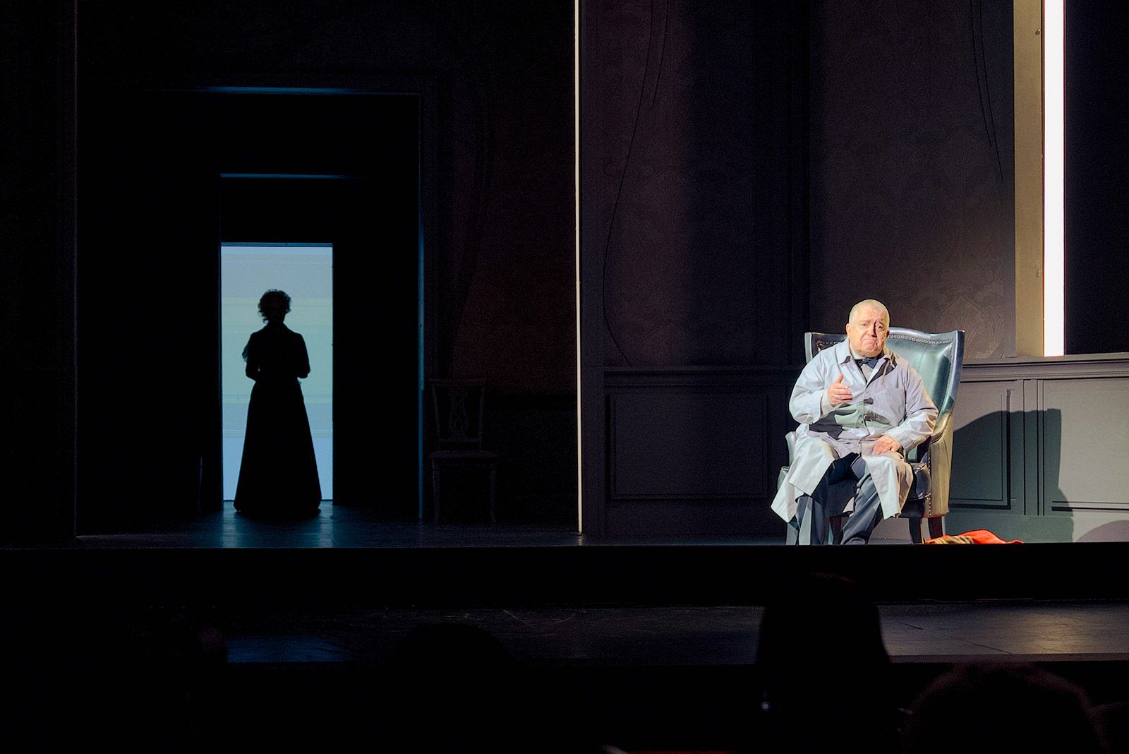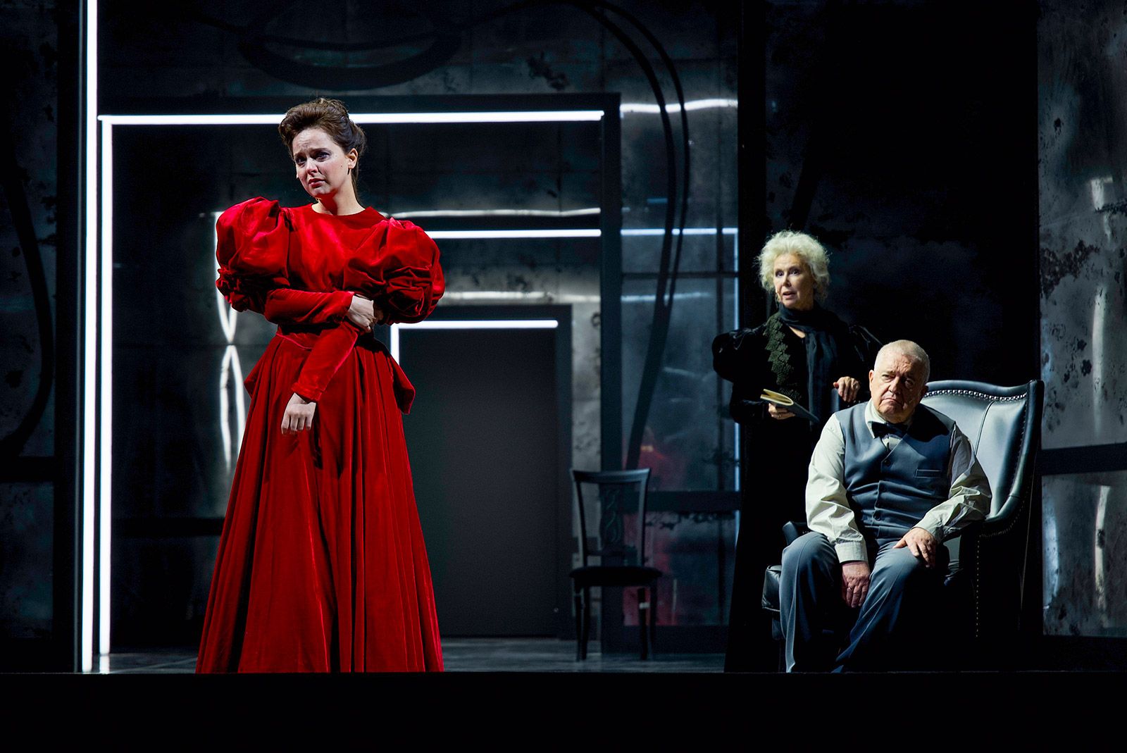 Варвару Андреевну воплощает блистательная Евгения Симонова, и этот образ, созданный в повести несколькими пассажами, в постановке Дениса Хусниярова получает новое измерение. Если у Чехова рассказчиком выступает Николай Степанович, что производит эффект тотального погружения в чертоги разума и омут памяти человека, стоящего на краю смерти и драматично осознающего свое несчастье при внешнем благополучии, то в спектакле одинаковая по накалу эмоциональная нагрузка падает и на его супругу. В этом тонком отступлении постановочной группы от оригинала — ее милосердие по отношению к главному герою и тому состоянию, вырваться из которого он никак не может.