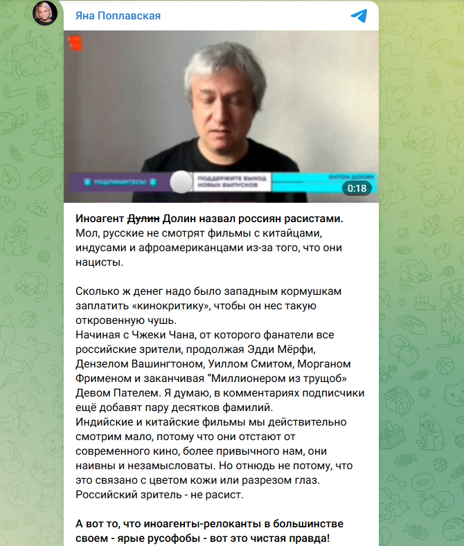 Беглый кинокритик, ныне "нетвойнист" и иноагент Антон Долин* пробил дно. Он обличил русских зрителей, заявив, что они не смотрят китайских, индийских и прочих фильмов по простой причине: "Расисты!" Ответка на столь наглую ложь прилетела неожиданно - от актрисы Яны Поплавской. Она изящно "отбрила" лжеца: "Сколько ж денег надо было западным кормушкам заплатить "кинокритику".