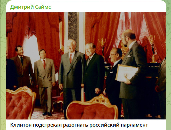 Вернувшись в США, Никсон пытался предостеречь Клинтона от безусловной опоры на Ельцина. Он советовал поддерживать реформы, но не закрывать глаза на риски. Однако в апреле 1993-го Клинтон встретился с Ельциным в Ванкувере, и, как вспоминал Саймс, его советник Строуб Тэлботт хвалился: "Мы сказали ему все правильные вещи". На деле же, по данным русских дипломатов и источников в Вашингтоне, Клинтон и Тэлботт подталкивали Ельцина к жёсткому курсу против парламента и обещали полную поддержку США.