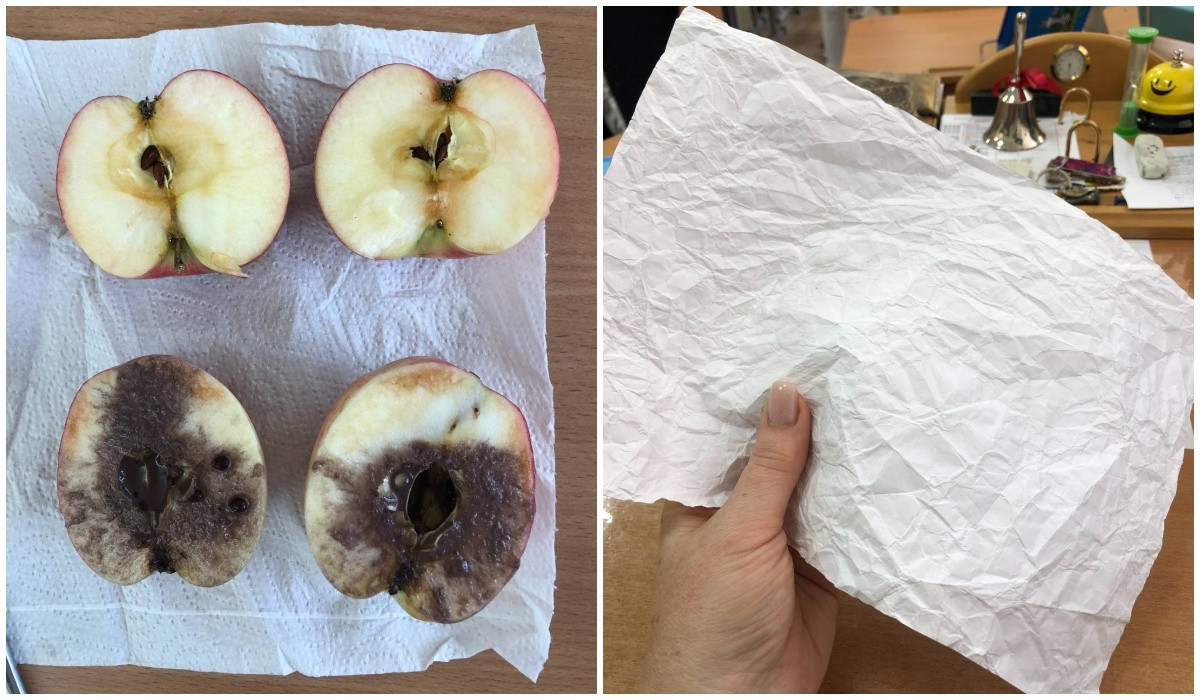 Когда яблоко вернулось ко мне, я положила его на стол и принесла из игровой второе. Еще раз спросила ребят, видят ли дети какую-то разницу между этими яблоками. Дети были в замешательстве, ведь, несмотря на то что они бросали яблоко, каких-то серьезных внешних повреждений оно не получило и выглядело практически так же, как второе.