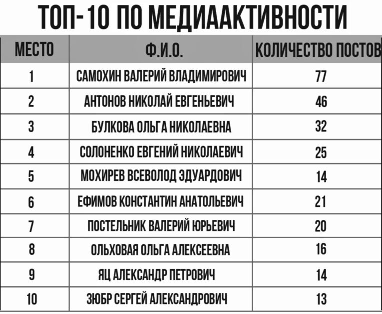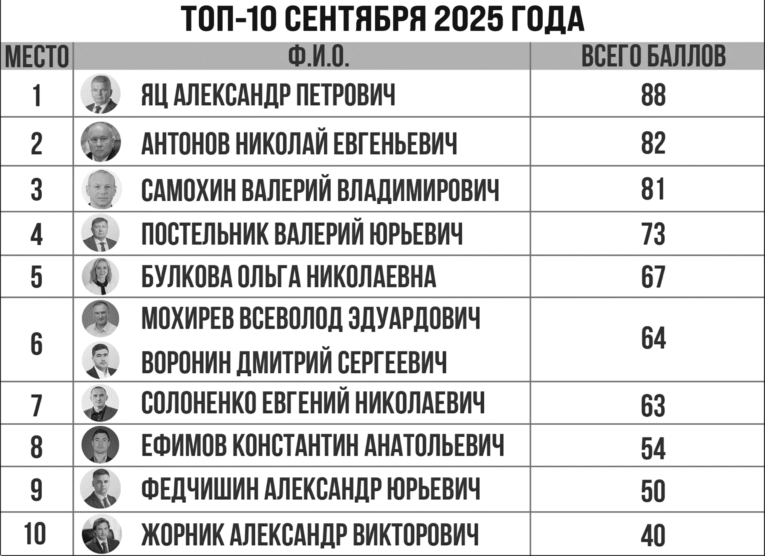 Рассмотрев в отдельности каждый критерий, можем, сложив баллы, назвать депутатов, вышедших на первые 10 мест, определяющих их работу в сентябре 2025 года.