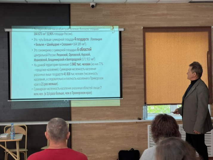 Кандидат геолого-минералогических наук Юрий Игоревич Берсенев, первый директор национального парка «Зов тигра», прочёл лекцию с показом презентации об особо охраняемых территориях Ольгинского округа. Привел интересные факты о пещерах, которые он посетил все в Приморском и Хабаровском краях.