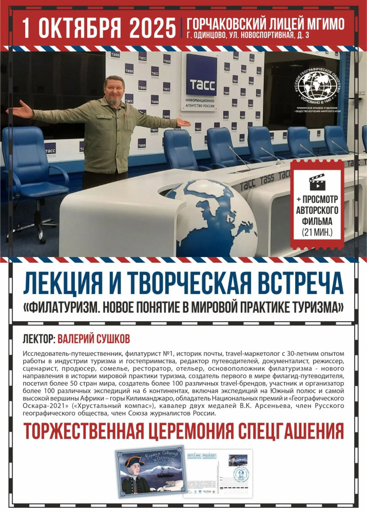 1 октября 2025 г. в 13:30 во Всемирный день почтовой карточки (открытки) в Горчаковском лицее МГИМО г. Одинцово состоялась лекция и творческая встреча с основоположником филатуризма, исследователем-путешественником и историком почты, Валерием Сушковым, а также торжественная церемония спецгашения почтового выпуска в серии «География с историей».