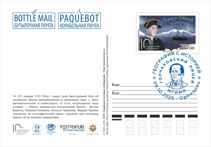 Эмитентом почтового выпуска в серии «География с историей» в честь 300-летия Великой Северной экспедиции под руководством командоров Витуса Беринга и Алексея Чирикова, представленного «Бутылочной почтой» и «Корабельной почтой», включающий в себя почтовую открытку, марку-виньетку и спецштемпель, выступил Горчаковский лицей МГИМО и Всероссийский проект развития филатуризма «POSTVENTURE & Почтовое приключение», при поддержке Приморского краевого отделения Русского географического общества – Общества изучения Амурского края и Министерства Морской & Бутылочной Почты (ООО «Традиции почтовых сообщений», г. Владивосток).