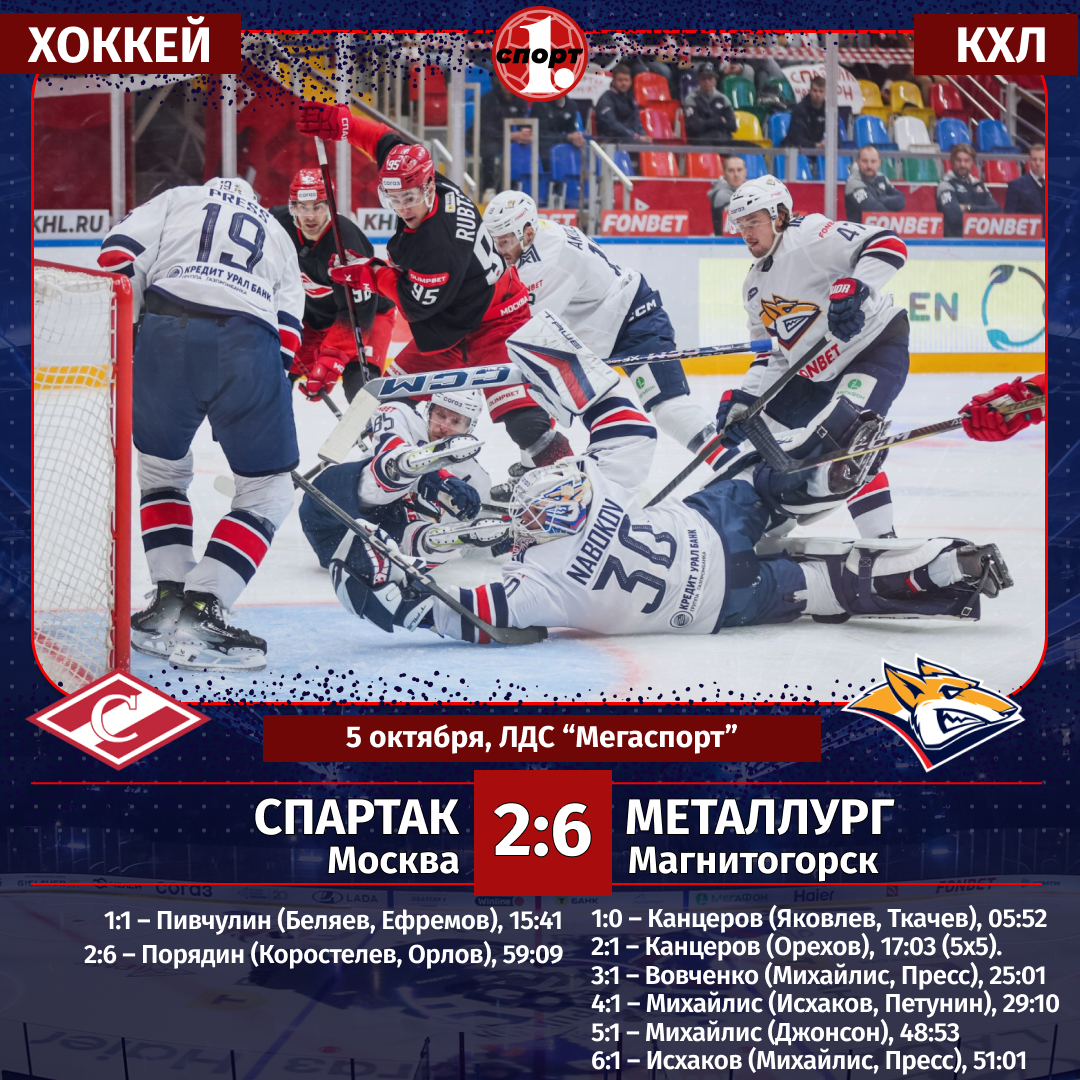 Хоккей. Чемпионат КХЛ. Сезон-2025/2026. 5 октября. «Спартак» (Москва) — «Металлург» (Магнитогорск) — 2:6 (1:2, 0:2, 1:2).