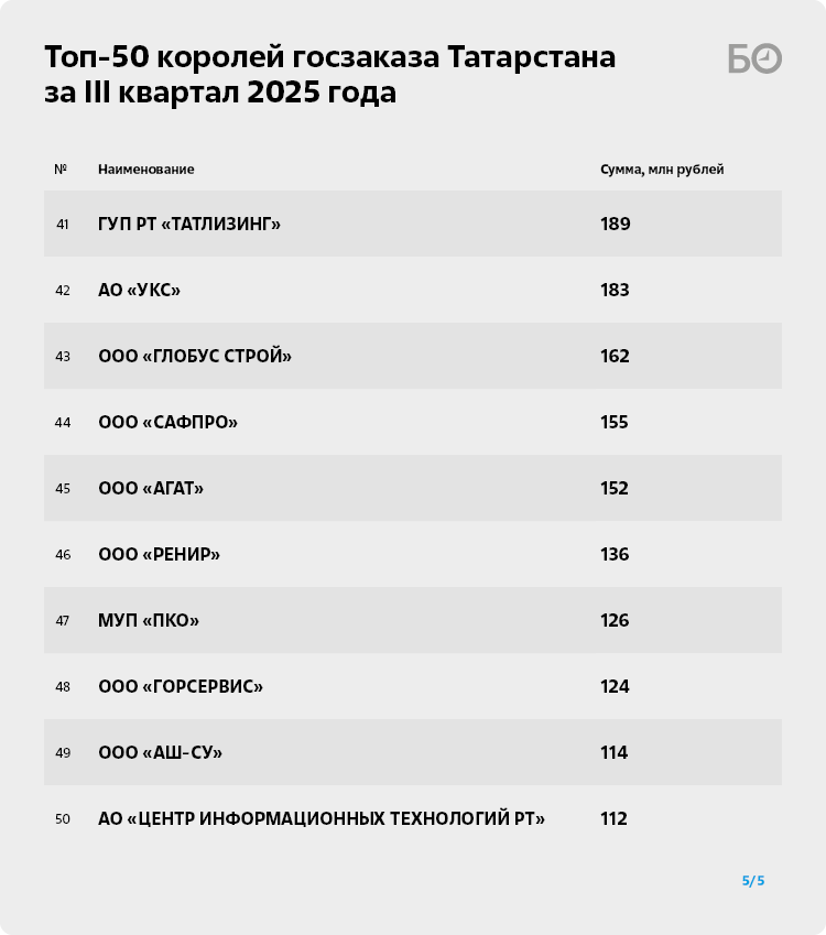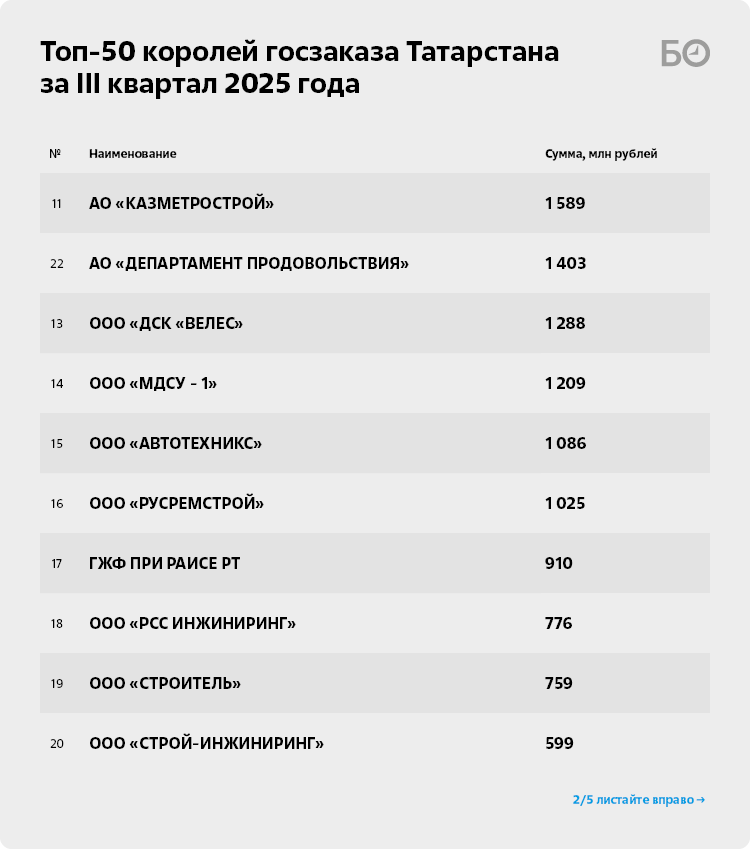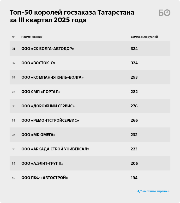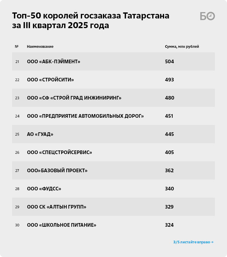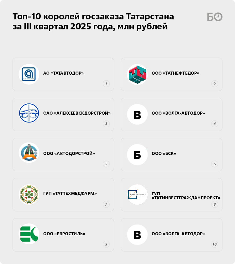 «Бронзу» среди лучших «потребителей» бюджетных денег получает известная в республике компания, занимающаяся строительством дорог, — ОАО «Алексеевскдорстрой» депутата Госсовета РТ Фоата Валиева и Алексея Демидова (двоюродного брата главы Алексеевского района РТ). Стоимость заключенных господрядов составила 3,7 млрд рублей при подписанных 30 контрактах. К сведению, за аналогичный период 2024 года компания выиграла в тендерах почти 1,45 млрд рублей, что тогда соответствовало 6-му месту в рейтинге топ-50 получателей госзаказов. К слову, в сентябре 2025-го фирма, отвечающая за строительство объезда Сокуров, открыла рабочее движение по данной дороге — на два года раньше планового срока.