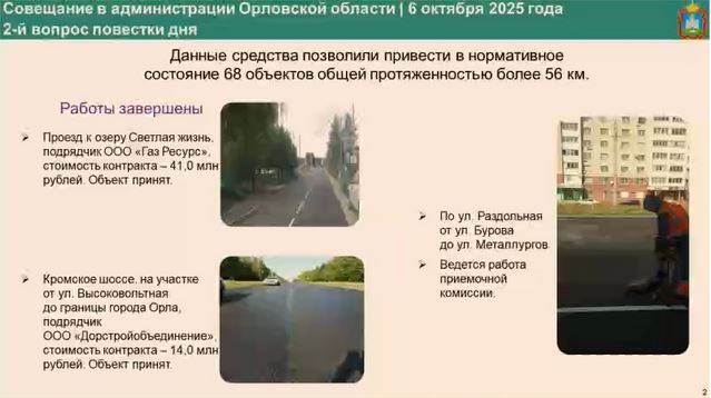 - Кромское шоссе на участке от ул. Высоковольтная до границы города Орла (подрядчик ООО «Дорстройобъединение», стоимость контракта 14 млн рублей, объект принят);