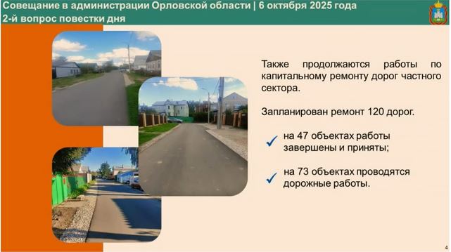 Одновременно продолжаются работы по ремонту дорог в частном секторе города Орла. Всего запланирован ремонт 120 дорог, из которых в настоящее время работы завершены и приняты на 47 объектах.