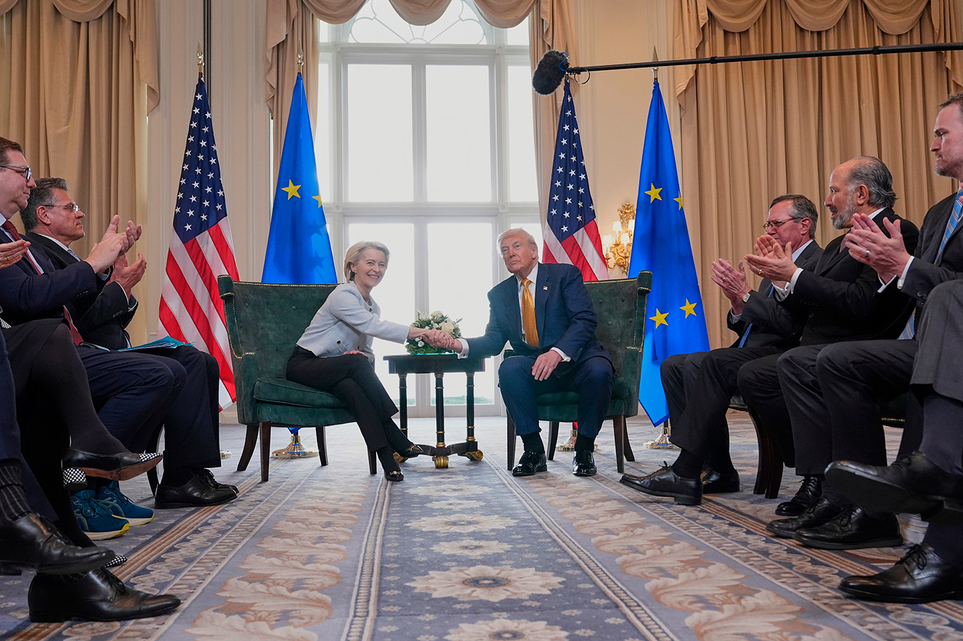 Между ЕС и США нет соглашения о свободной торговле. Переговоры о Трансатлантическом торговом и инвестиционном партнерстве, которые стартовали в 2013 г., были официально завершены в 2019 г. Тем не менее США остаются главным торговым партнером ЕС. Объем торговли товарами между ними в 2024 г. составил более 830 млрд евро, следом идет Китай с 732 млрд евро. На Соединенные Штаты приходится самая большая доля европейского экспорта товаров — более 20%, а импорта — больше 13%, в этом показателе США уступают только Китаю. Если учитывать торговлю товарами и услугами, а также объем взаимных инвестиций, то ЕС и США выступают крупнейшими экономическими партнерами друг друга. Особый статус Соединенных Штатов накладывает отпечаток на поведение Брюсселя в отношении Вашингтона и в других сферах, включая борьбу с изменением климата.