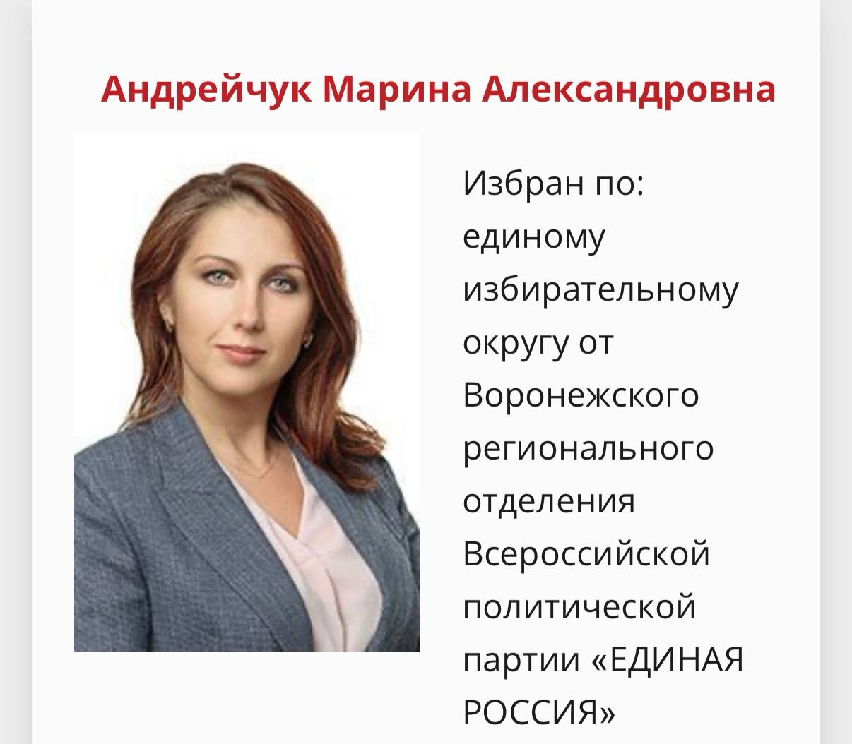 47-летняя Марина Александровна – уроженка поселка Воля Новоусманского района. В 1999 году получила специальность преподавателя филологии, окончив ВГУ. За время своей карьеры успела потрудиться на руководящих должностях в «Мебели Черноземья» и юрлицах «Галереи Чижова», работав преимущественно в сферах продаж и рекламы. С 2005 по 2010 годы Марина Андрейчук была зампредом комитета по местному самоуправлению, связям с общественностью и СМИ. В 2015 чуть больше месяца проработала в администрации Воронежа, затем до сентября 2020 года трудилась на посту замруководителя управы Ленинского района. После этого стала депутатом облдумы, избравшись по единому округу. В этом созыве она пролонгировала свои полномочия.