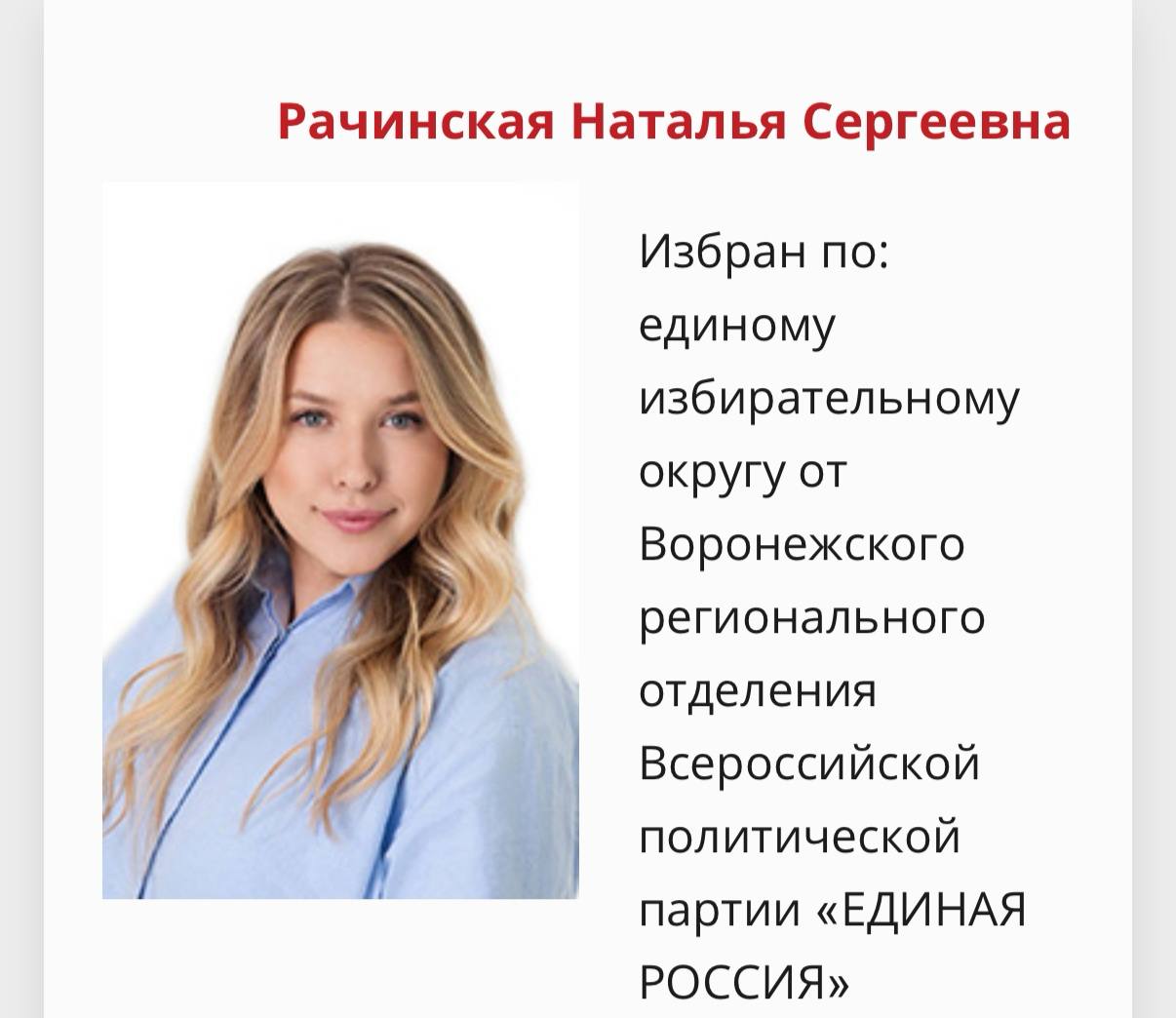 Еще одно новое лицо в списке представителей регионального заксобрания –Наталья Сергеевна Рачинская. Родилась в Воронеже в 1985 году. В 2007 получила специальность регионоведа, окончив российскую академию госслужбы при Президенте РФ. В 2013 окончила аспирантуру на кафедре «Государственной службы и кадровой политики» Российской академии государственной службы при Президенте Российской Федерации в Москве. Специальность – «Социология управления». С 2011 по 2025 трудилась в региональном исполкоме «Единой России», с 2021 являлась членом регионального штаба #МЫВМЕСТЕ. В 2022 году Наталья Рачинская также стала региональным координатором партийного проекта «Историческая память».