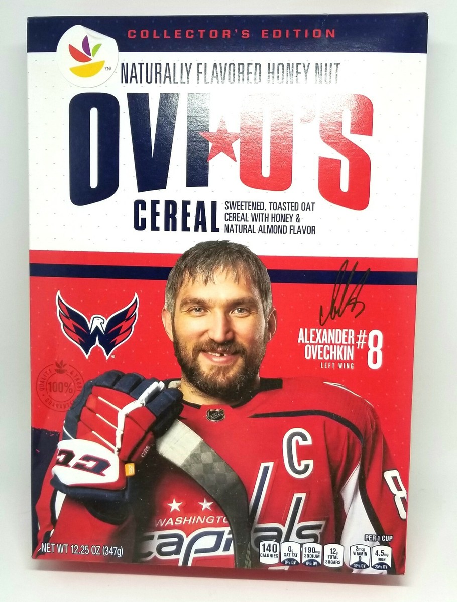 Коробка Ovi O’s была оформлена в красно-бело-синих цветах в стиле формы «Кэпиталз», а на лицевой стороне красовалась фотография улыбающегося российского нападающего.