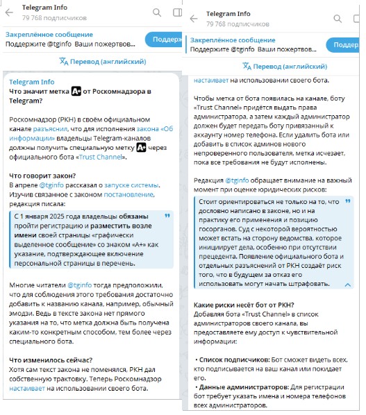 Теперь владельцы Telegram-каналов, имеющие 10 тысяч подписчиков и больше, не только обязаны регистрироваться Роскомнадзоре — в противном случае они не смогут публиковать рекламные материалы и интеграции. К этому прибавляется обязанность добавить в администраторы бота от РКН, через который можно получить значок А+, указывающий на то, что страница включена в перечень ведомства.