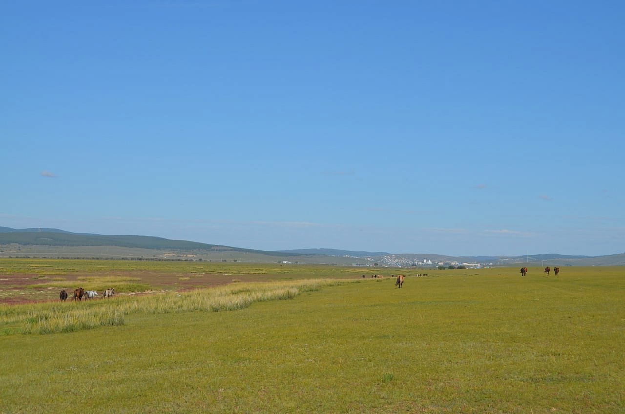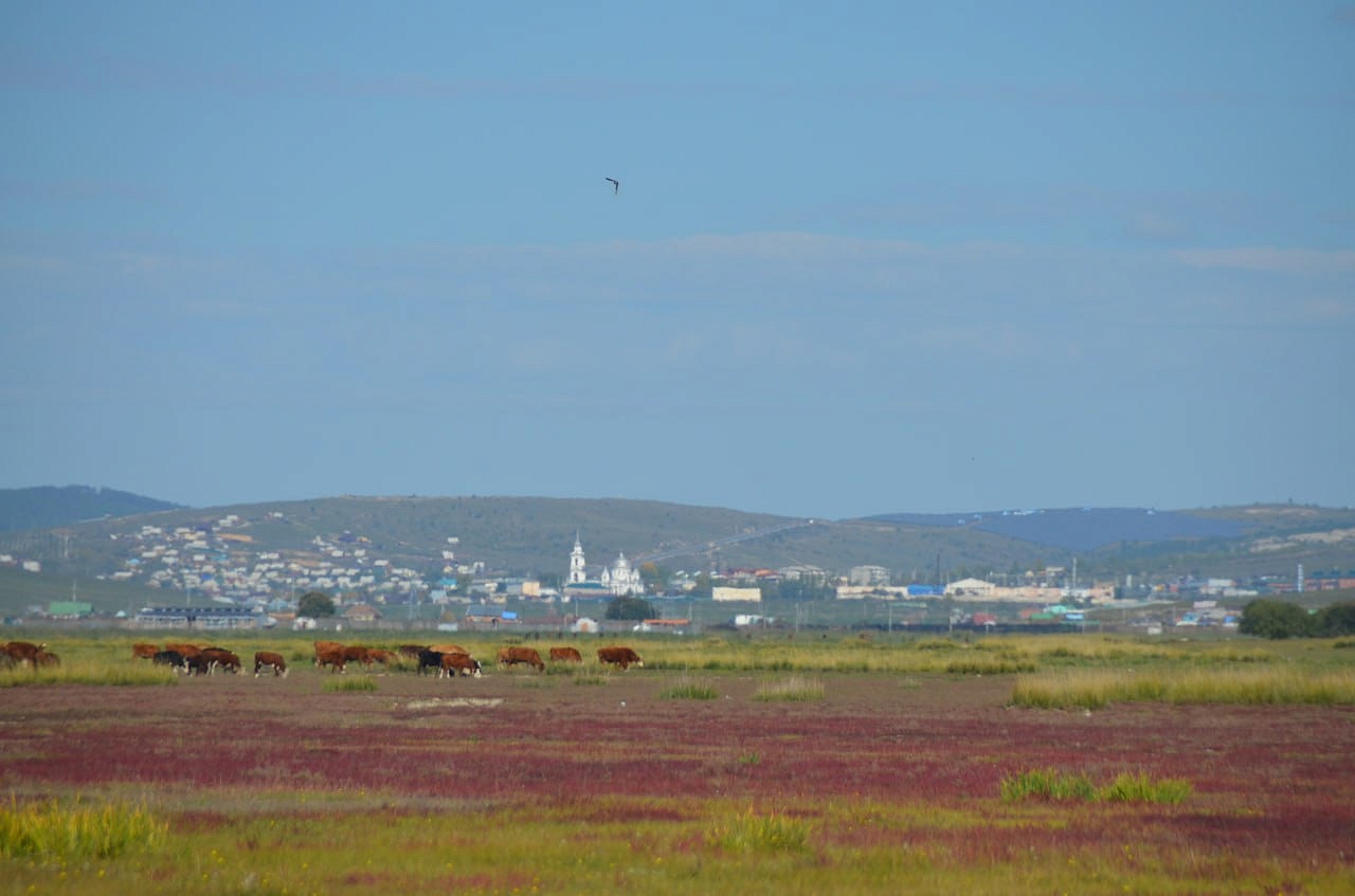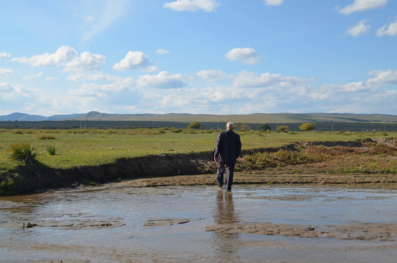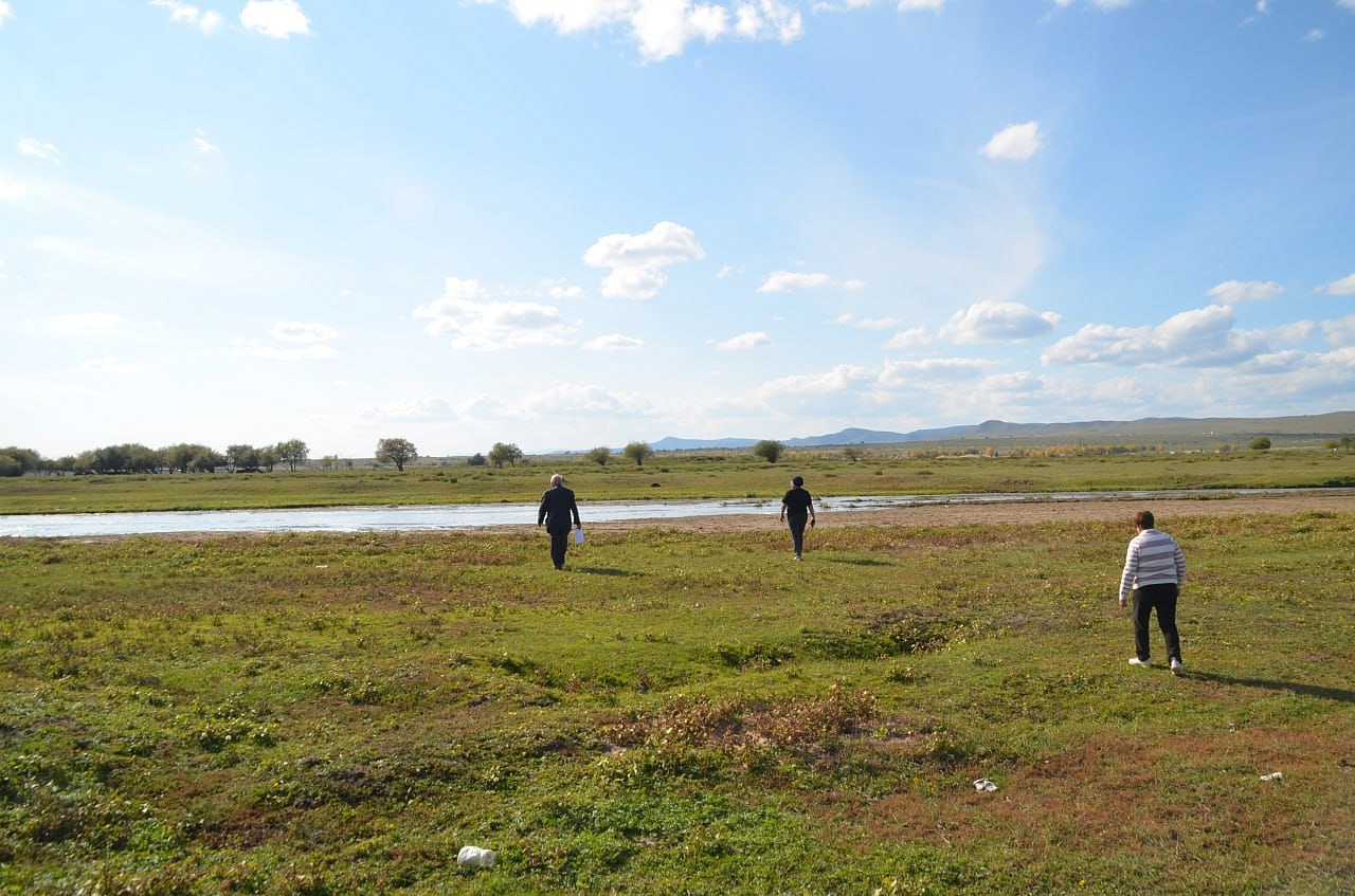 Дальше на машине уже мы проехали вдоль речки и нашли нашу речку Кяхту, прозрачную, мелковатую, но разливающуюся по руслу на рукава. В этих местах она впадала в Буру. Игорь Антонович предположил по высоте берегов, что раньше речка была довольно полноводной. Мы умылись чистой, прозрачной водой, Игорь Антонович гордо прошагал в обуви через неё. Везде паслись коровы, лошади. Видели мы много грифов, в озерцах плавали утки. Дальше наш путь лежал в город Сухэ-Батор. Там мы встретились снова с рекой, которая впадала в реку Орхон, а Орхон наблюдали с высокой горы, где за поворотом она предположительно впадает в Селенгу, но это мы не увидели уже.