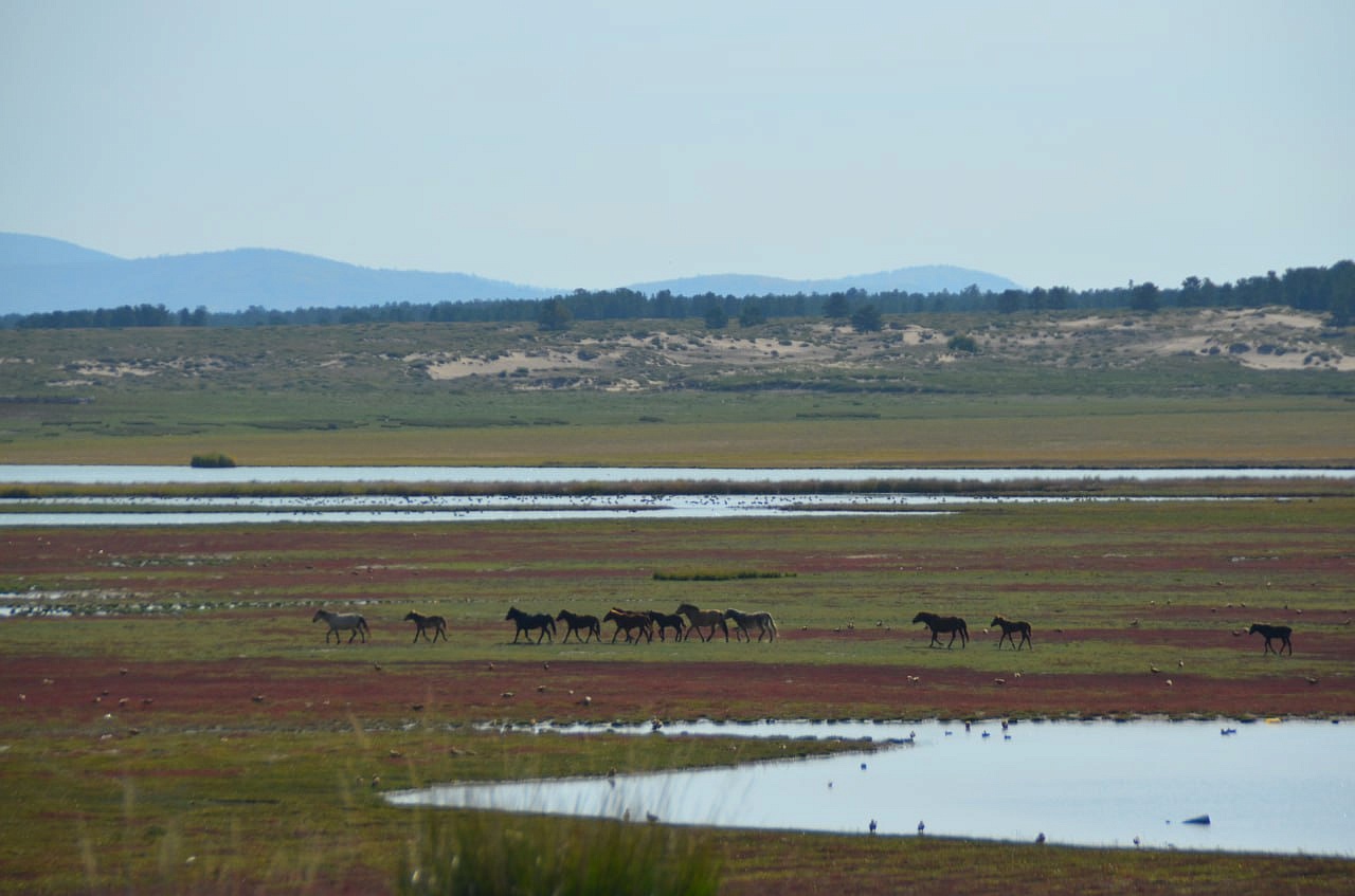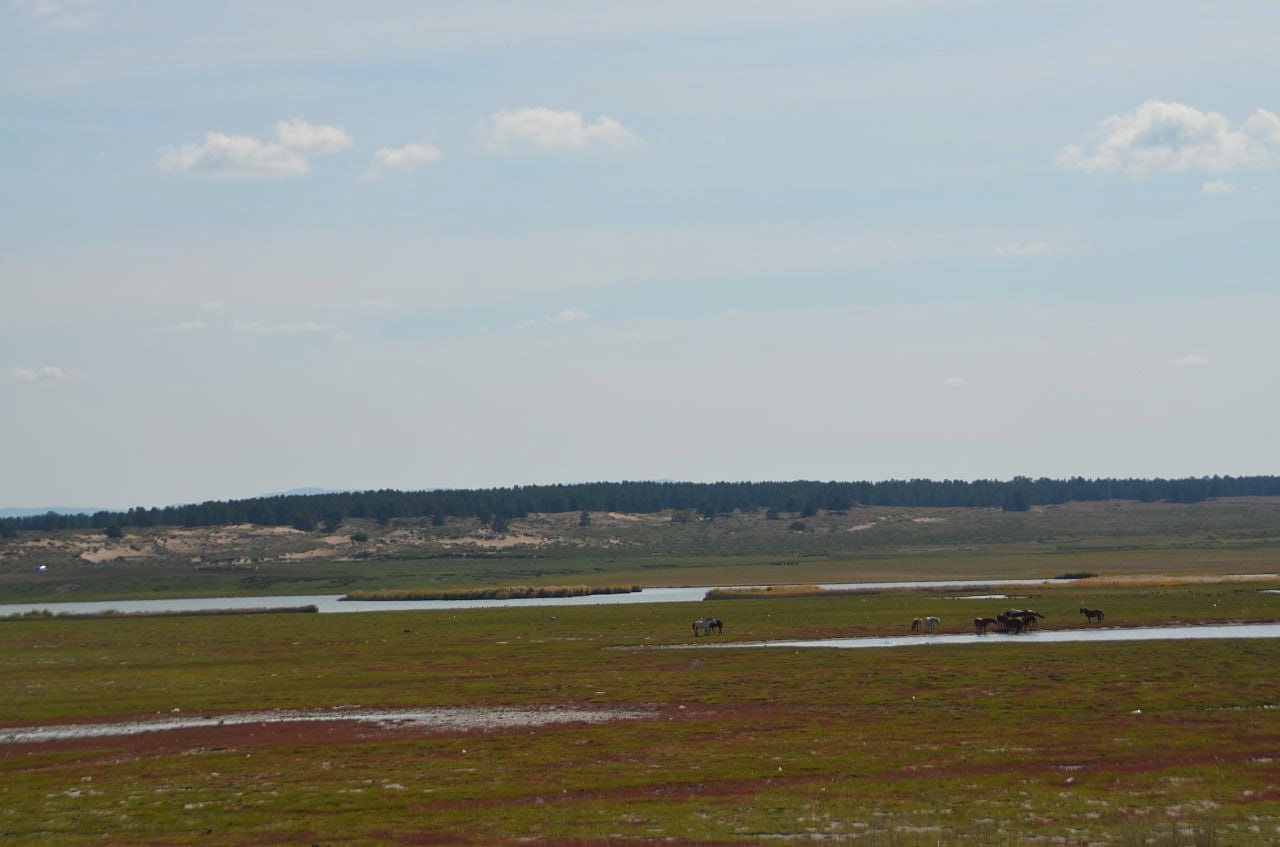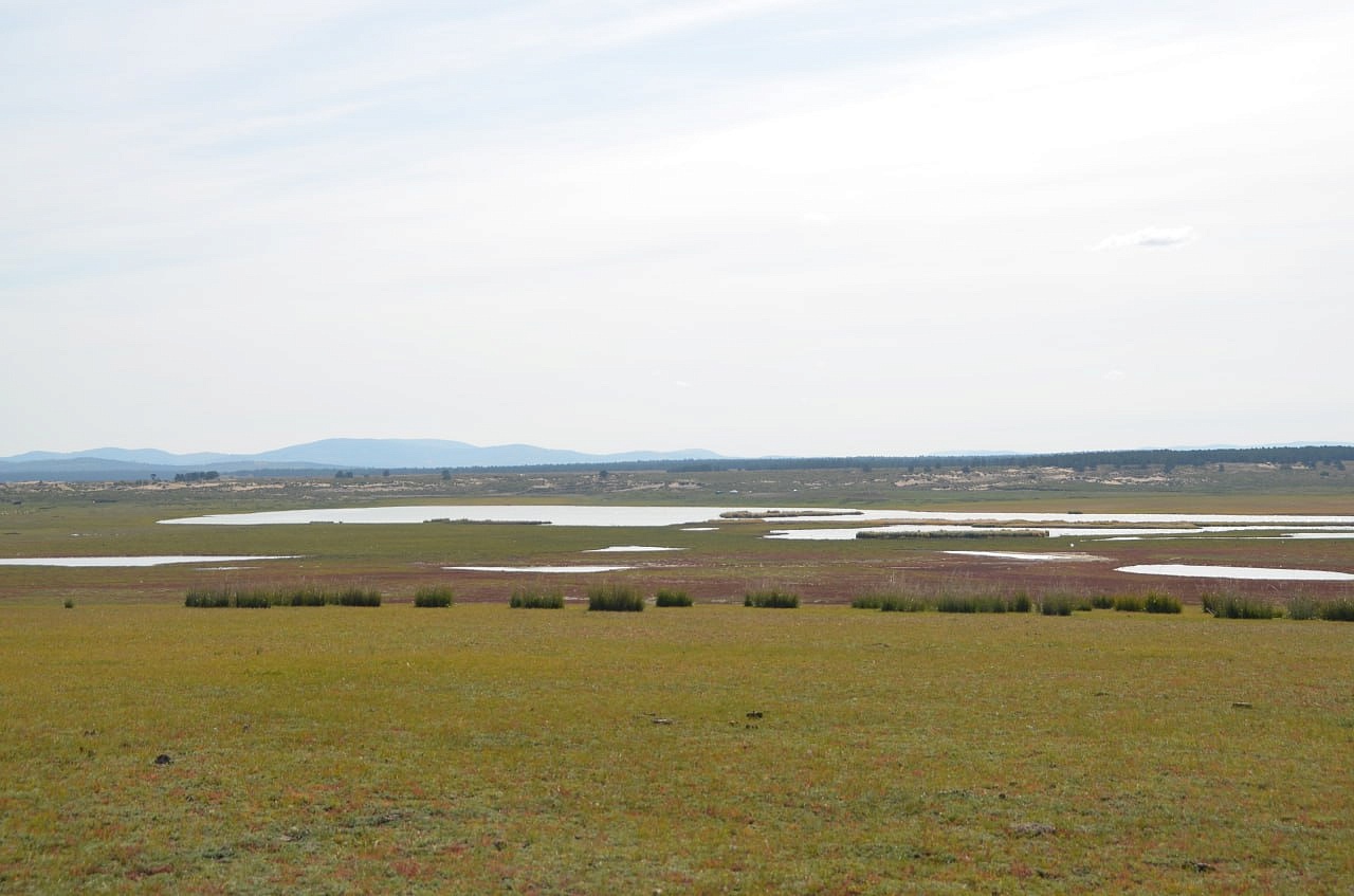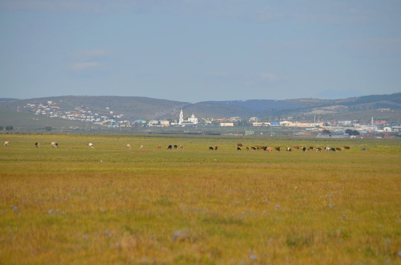 Дальше на машине уже мы проехали вдоль речки и нашли нашу речку Кяхту, прозрачную, мелковатую, но разливающуюся по руслу на рукава. В этих местах она впадала в Буру. Игорь Антонович предположил по высоте берегов, что раньше речка была довольно полноводной. Мы умылись чистой, прозрачной водой, Игорь Антонович гордо прошагал в обуви через неё. Везде паслись коровы, лошади. Видели мы много грифов, в озерцах плавали утки. Дальше наш путь лежал в город Сухэ-Батор. Там мы встретились снова с рекой, которая впадала в реку Орхон, а Орхон наблюдали с высокой горы, где за поворотом она предположительно впадает в Селенгу, но это мы не увидели уже.