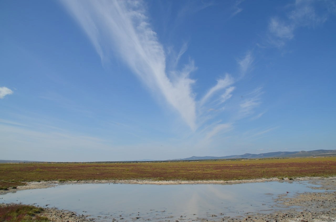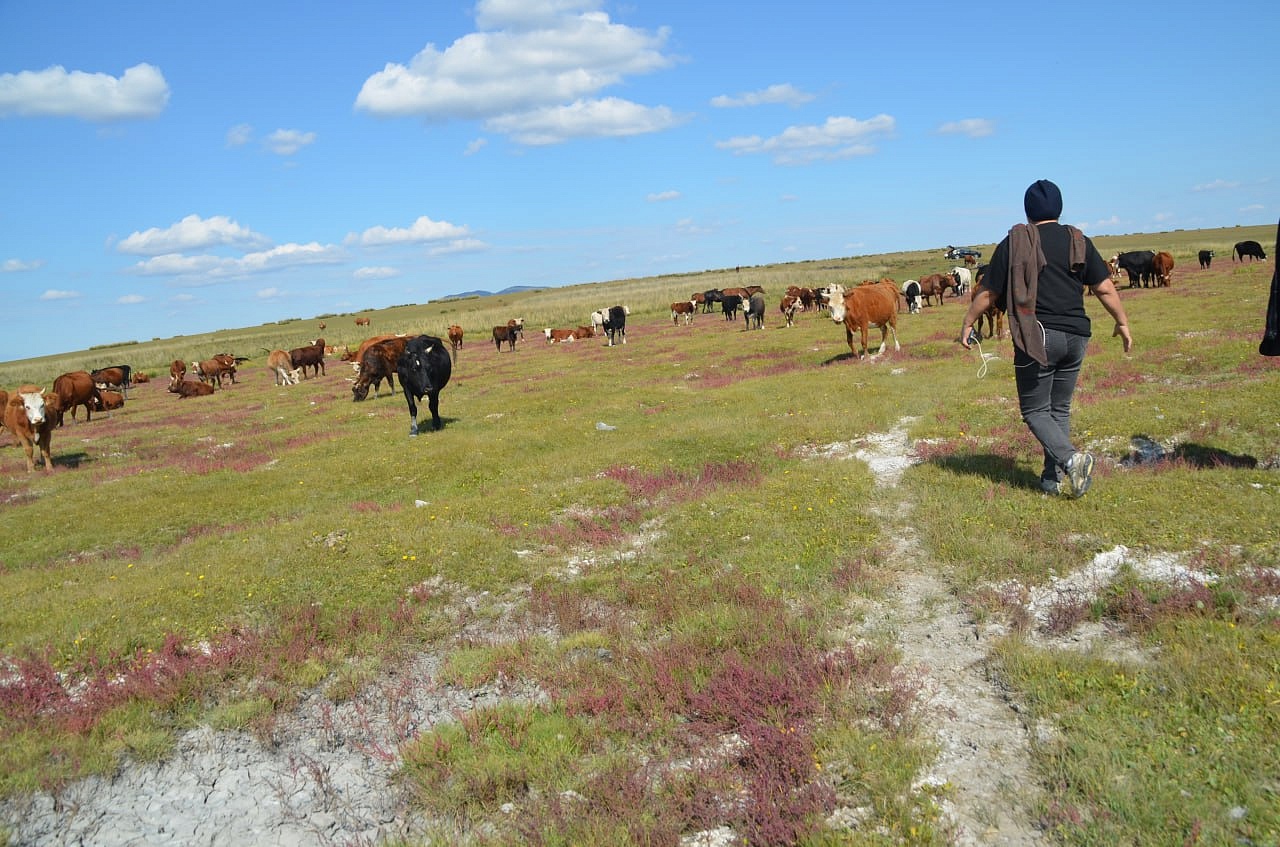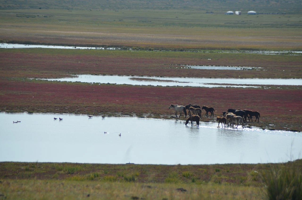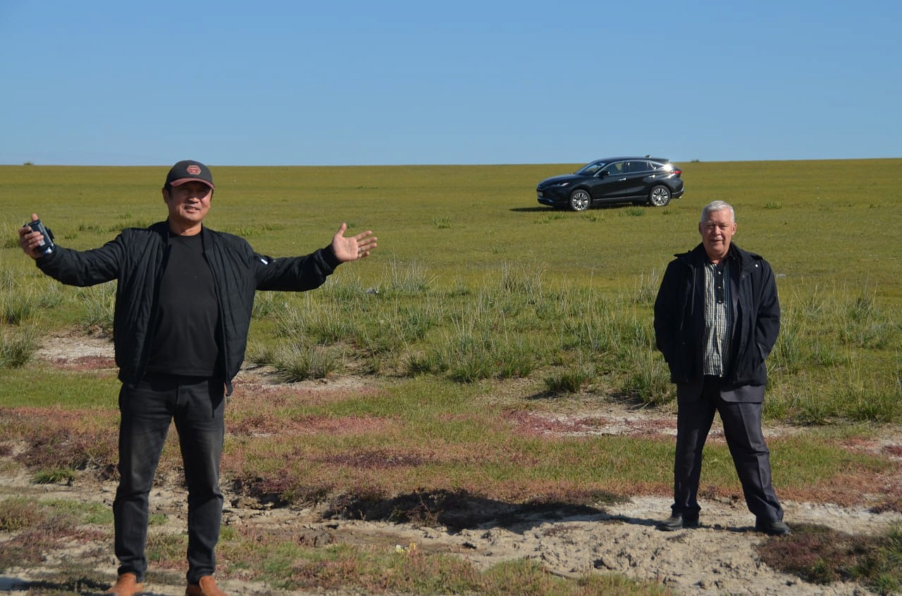 Дальше на машине уже мы проехали вдоль речки и нашли нашу речку Кяхту, прозрачную, мелковатую, но разливающуюся по руслу на рукава. В этих местах она впадала в Буру. Игорь Антонович предположил по высоте берегов, что раньше речка была довольно полноводной. Мы умылись чистой, прозрачной водой, Игорь Антонович гордо прошагал в обуви через неё. Везде паслись коровы, лошади. Видели мы много грифов, в озерцах плавали утки. Дальше наш путь лежал в город Сухэ-Батор. Там мы встретились снова с рекой, которая впадала в реку Орхон, а Орхон наблюдали с высокой горы, где за поворотом она предположительно впадает в Селенгу, но это мы не увидели уже.