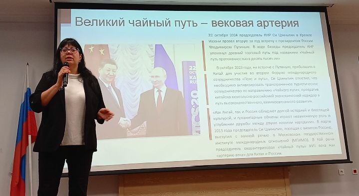 Ольга Ажгиревич, аспирант Уханьского университета, выступила с докладом «Китай-Бурятия на Великом чайном пути как культурный маршрут всемирного наследия ЮНЕСКО». Она сказала, что первая книга была совместная с Игорем Антоновичем по Великому чайному пути. В слайде «Великий чайный путь - вековая артерия» автор показала вторую за год встречу Председателя КНР Си Цзиньпина с президентом России В. Путиным в Казани 22 октября 2024 г. В ходе беседы председатель КНР упомянул торговый путь под названием «Чайный путь протяжённостью в десять тысяч ли».