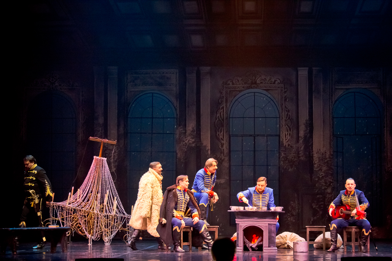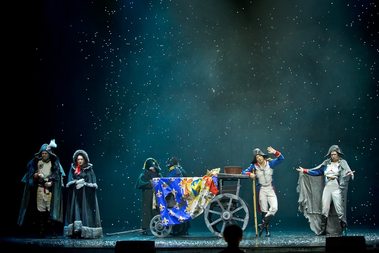 Эпичности баталиям придают развевающиеся на видеоэкране флаги противоборствующих сторон – России и наполеоновской Франции. В дальнейшей сцене флаг французов появляется и в натуральном виде – с дырами и подпалинами, прикрывающий обоз неприятеля, пробирающегося сквозь русскую зиму с трудом и с грустной песнью про Анри Четвертого. Красивым и печальным басом «ля-ля-ля-бум-бум…» поет француз Лепелетье (Антон ЗАВЬЯЛОВ) под живой оркестр.
