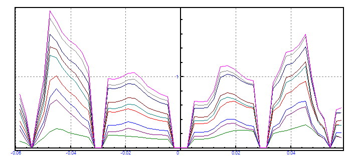 Пример расчета и графического представления в модули FETire накопления износа вдоль сечения профиля шины c увеличением пробега |