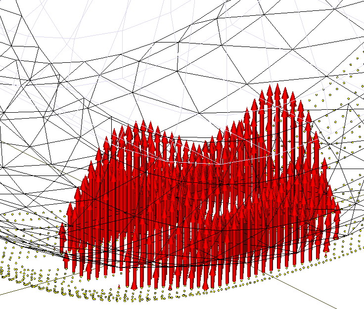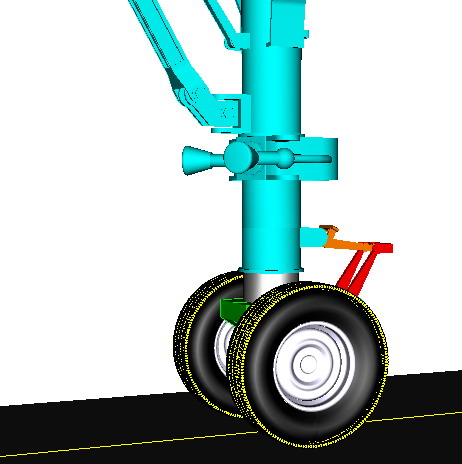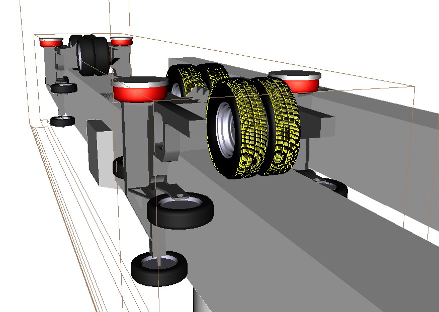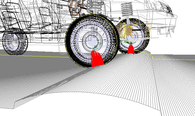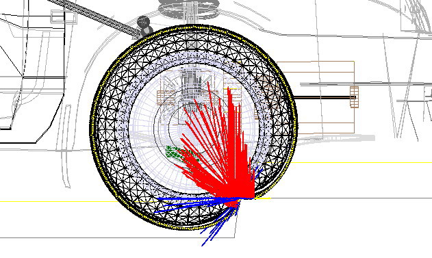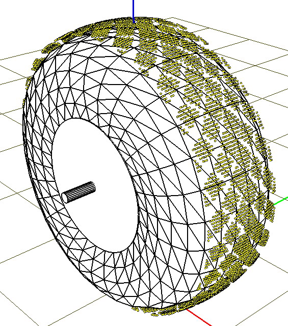 Для контакта шины с дорожным полотном реализуется щеточная модель взаимодействия, при которой контактная поверхность шины представляется набором упругих безынерционных щетинок, один конец которых связан с конечным элементом, а другой может вступать в контакт с опорной поверхностью, реализуя упруго-диссипативное взаимодействие в радиальном направлении и фрикционное – в касательном. На рисунке ниже желтые точки соответствуют концам щетинок, вступающим в контакт. Щетинки позволяют учитывать рисунок протектора шины.