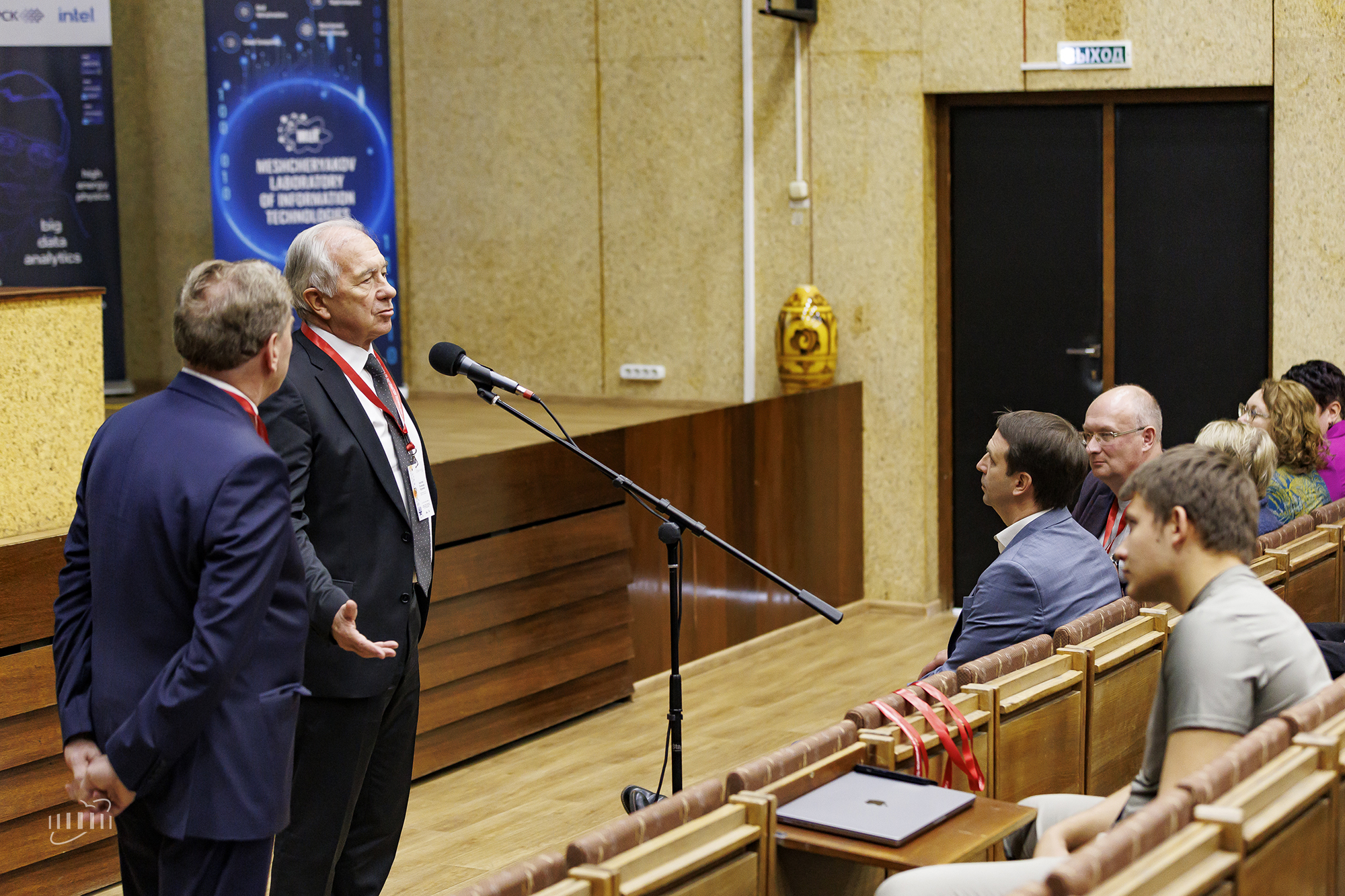 Научно-образовательную программу первого дня открыл доклад научного руководителя ЛИТ ОИЯИ Владимира Коренькова, посвященный методам обработки данных в гетерогенных вычислительных средах и достижениям ЛИТ в развитии IT-инфраструктуры. О применении компьютинга в области физики высоких энергий и значении информационных технологий для современных экспериментов рассказал Сергей Шматов. Помощник президентаНИЦ «Курчатовский институт»Василий Велихов выступил с лекцией о развитии национальной сети компьютерных телекоммуникаций для науки и высшей школы России.
