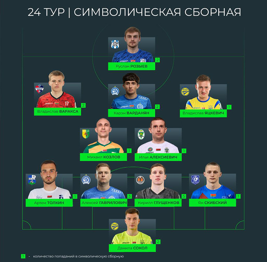 Ассоциация "Белорусская федерация футбола" обнародовала свою версию "команды недели" по итогам 24-го игрового дня чемпионата страны-2025 в элитном дивизионе.