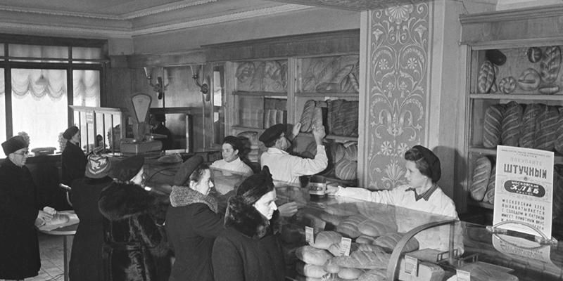В отделе хлебобулочных изделий магазина №19 1-го Московского государственного треста хлебопекарной промышленности во время торговли по новым сниженным ценам. Автор – Э. Евзерихин. Москва, 1951 г. Главархив Москвы